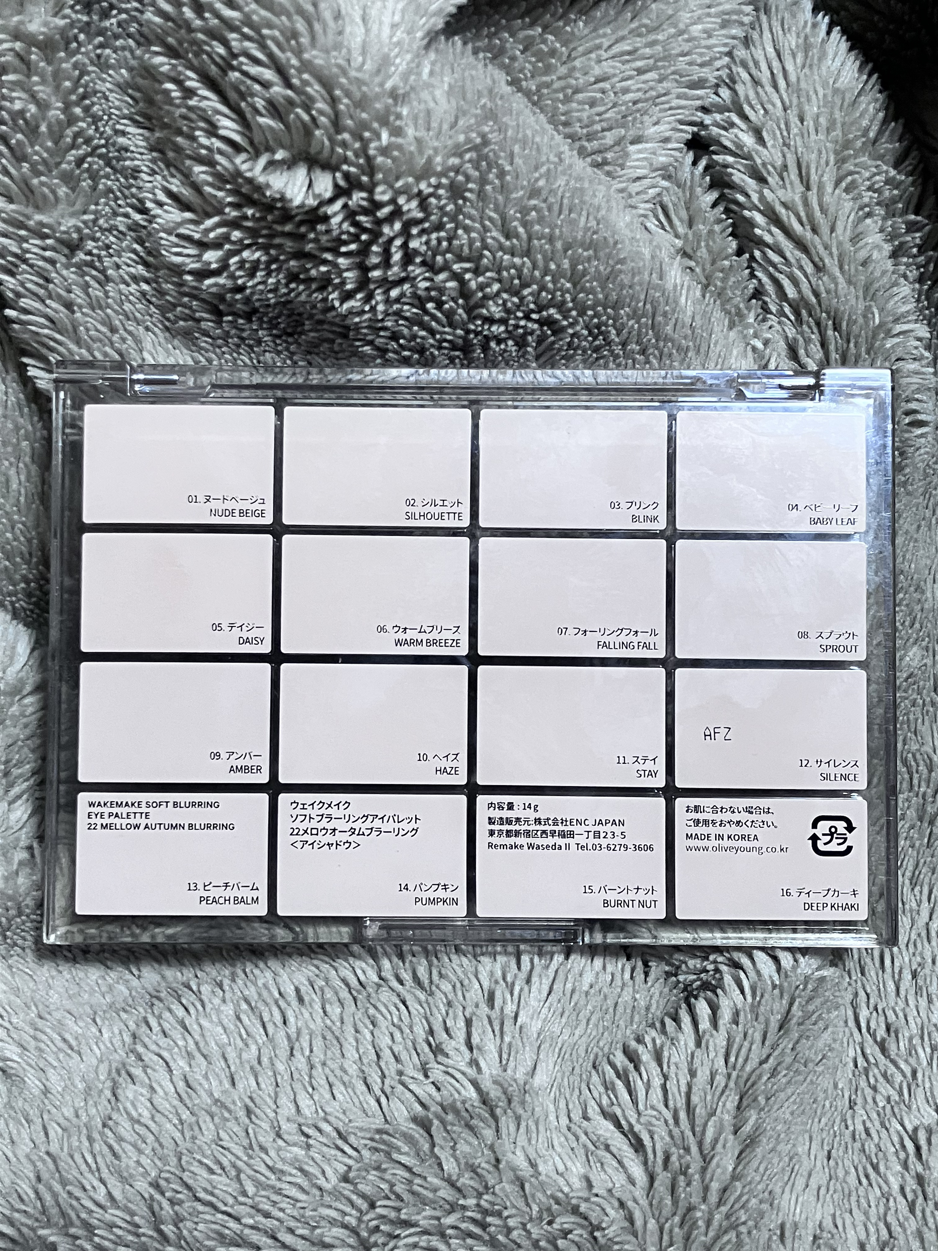 WAKEMAKEのソフトブラーリングアイパレットは、マット・パール・グリッターなど質感の異なる全16色のカラーが入ったアイパレット✨ 22 メロウオータムブラーリングのカラーは、深みのあるカラーにアクセントのあるスモーキーカーキ、暖かみのあるゴールディッシュイエローを感じるディープブラウン&スモーキーメイクルックだそうです🫠🌟 服や気分に合わせて色んなメイクができるのでおすすめです❣️