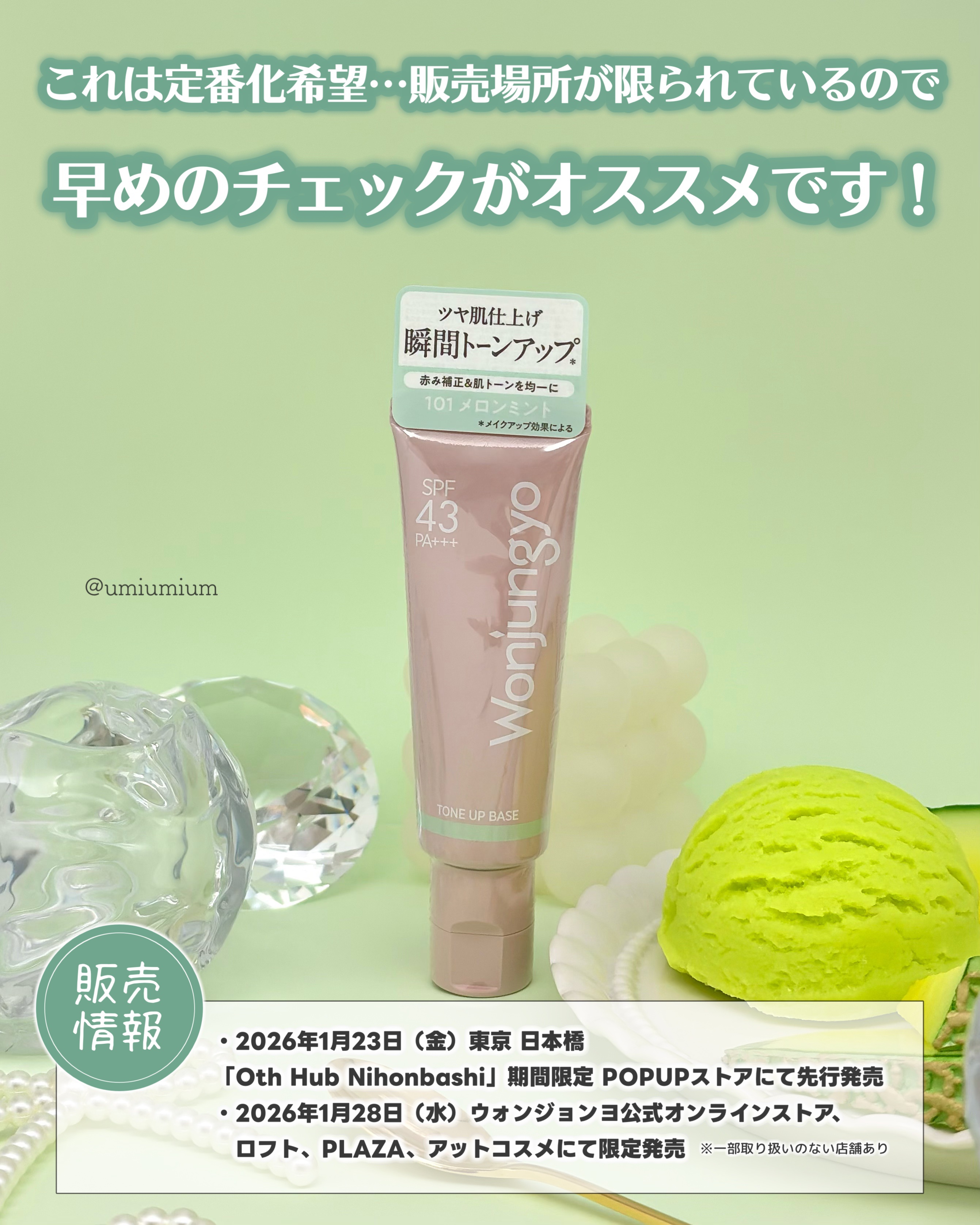 🍈気になる赤みに新作メロン下地 ウォンジョンヨ トーンアップベースN101メロンミント🍈Wonjungyoの人気瞬間トーンアップ*1ベースに赤みやニキビ跡を力バーする新作メロンカラーが限定登場するから早速レビュッ!✏︎🍈ウォンジョンヨトーンア...