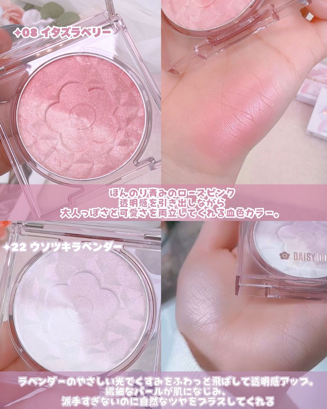 デイジードールのパウダーブラッシュから春の新色が登場🌸🫧⚜️DAISYDOLLbyMARYQUANTデイジードールパウダーブラッシュブルーム08イタズラベリー/22ウソツキラベンダー08イタズラベリーは青みピンク~ピンクベージュのグラデで華や...