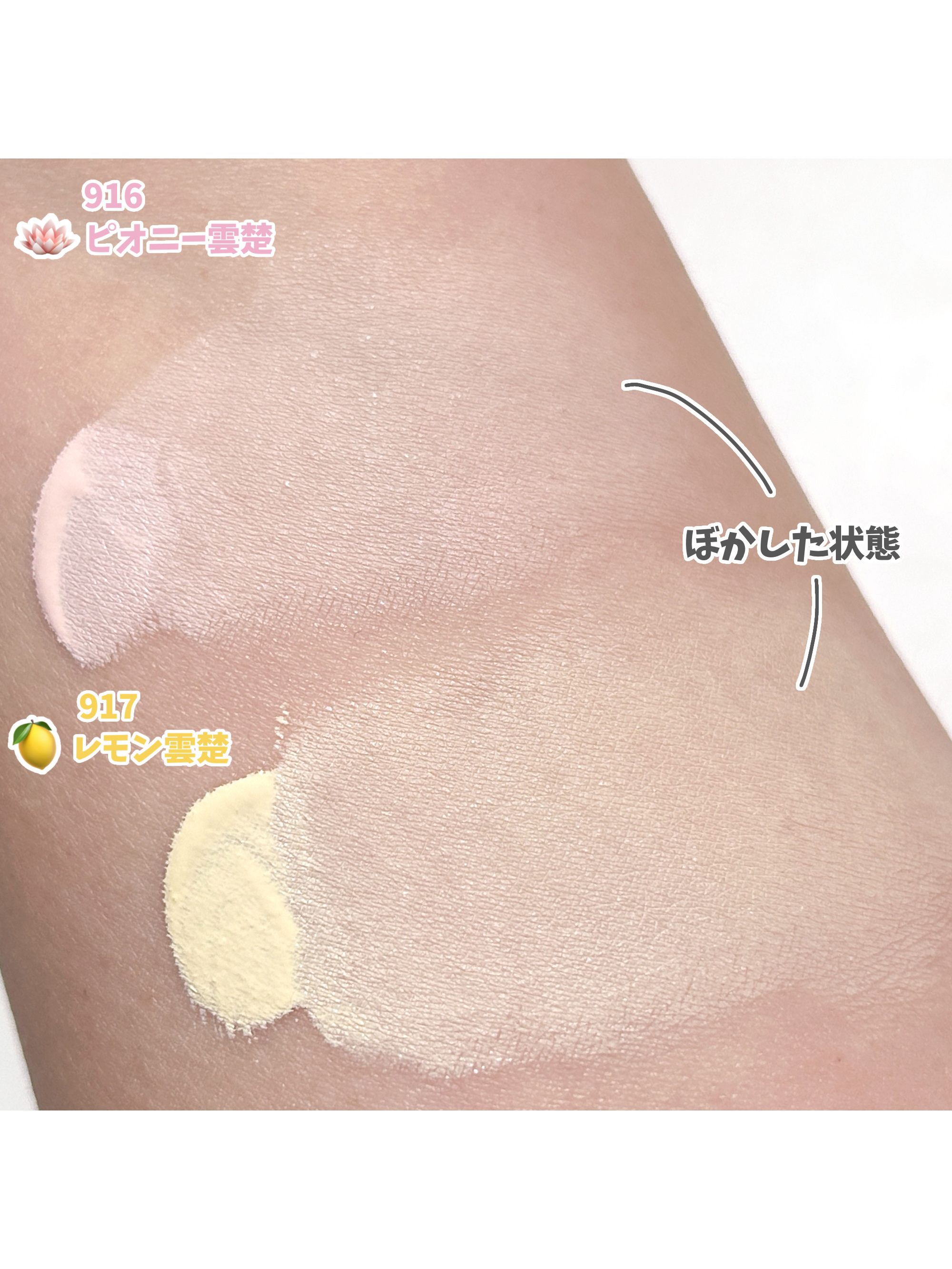 - <914 ライラック雲楚> 精製水、チタンジオキシド、イソドデケイン、トライメチルシロキシシリケート、ポリプロピルシルセスキオキセイン、ポリグリセリル-3ポリジメチルシロキシエチルジメチコン、ヒドロゲネチドポリ(C6-14オレフィン)、フェニルトライメチコン、グリセリン、ウルトラマリン、メチルメタクリレートクロスポリマー、カプリリルメチコン、ダイステアーダイモニウムヘクトライト、1,2-ヘキサンジオール、ポリグリセリル-3ポリリシノリエイト、マグネシウムスルフェイト、ダイメティコン/ビニールダイメティコンクロスポリマー、ソルビタンセスキオリエイト、ダイメティコンクロスポリマー、アルミニウムヒドロキシド、トライエトキシカプリリルシレイン、赤色酸化鉄、アラントイン、エチルヘキシルグリセリン、パンテノール、香料、ベンジルベンゾエイト、リナルール、シトロネルオール、アミールシンナムアル、ヘキシルシンナムアル、ユゼノール、シンナミルアルコール、ブチレングライコール、オクラ果実エキス、麻根エキス、カプリルヒドロキサミックアシッド、トコフェロール、メキシカンチア種子エキス、亜麻種子エキス、ナトリウムソイヒドロライズドコラーゲン、ブドウ皮エキス、レモンエキス、ラベンダー花エキス <915 ピーチ雲楚> 精製水、チタンジオキシド、イソドデケイン、トライメチルシロキシシリケート、フェニルトライメティコン、ポリグリセリル-3ポリジメチルシロキシエチルジメチコン、ヒドロゲネチドポリデセン、グリセリン、ポリプロピルシルセスキオキセイン、ポリグリセリル-3ポリリシノリエイト、黄色酸化鉄、ダイステアダイモニウムヘクトライト、1,2-ヘキサンジオール、ジメチコンクロスポリマー、メチルメタクリル酸塩、マグネシウムスルフェート、赤色酸化鉄、ダイメティコン/ビニールダイメティコンクロスポリマー、アルミハイドロキサイド、ソルビタンセスキオリエイト、トライエトキシカプリリルシレイン、アラントイン、エチルヘキシルグリセリン、パンテノール、黒色酸化鉄、香料、ベンジルベンゾエイト、リナルール、シトロネルオール、アミールシンナムアル、ヘキシルシンナムアル、ユゼノール、シンナミルアルコール、ブチレングライコール、オクラの実エキス、麻根エキス、カプリルヒドロキサミックアシッド、メキシカンチア種子エキス、トコフェロール、亜麻種子エキス、ソジウムソイヒドロライズドコラーゲン、ぶどう皮エキス、レモンエキス、ラベンダー花エキス