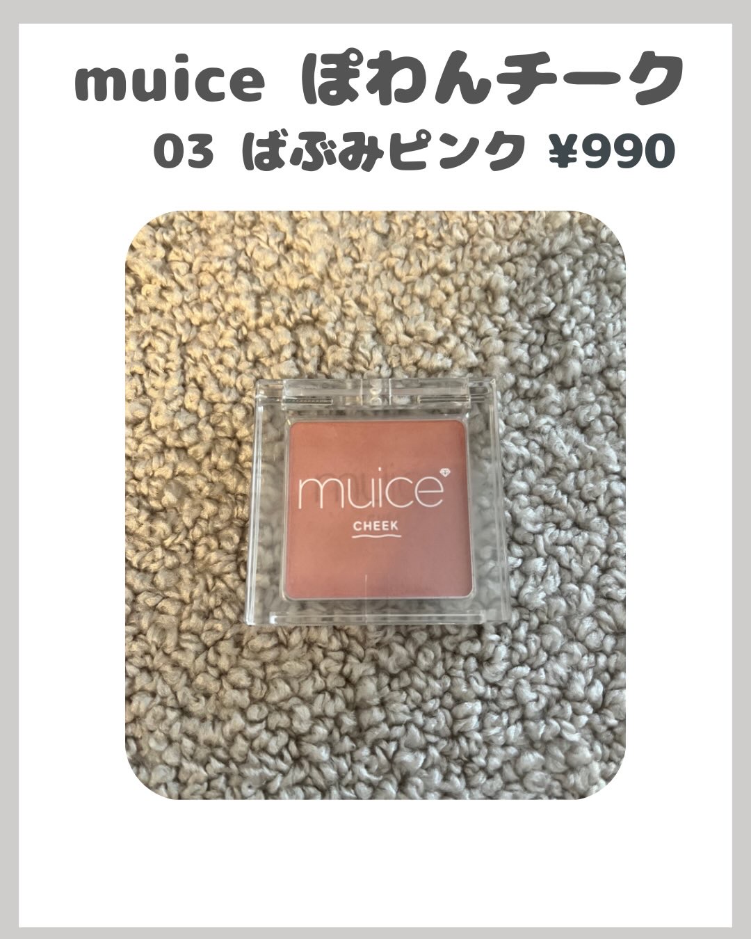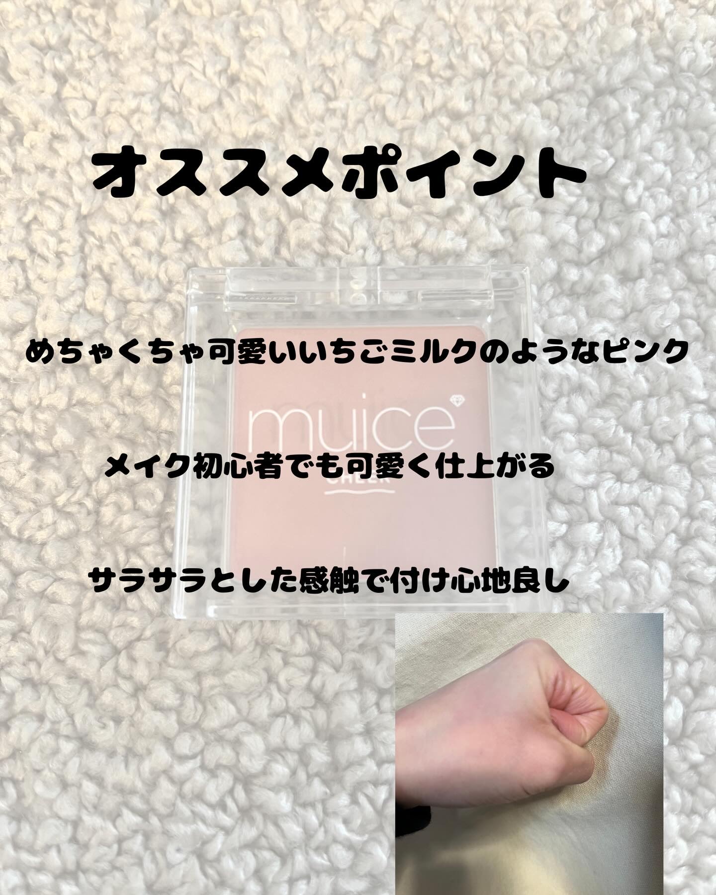 発色の良さ!! サッとブラシひとぬりで発色👏🏻 ばぶみピンクはそんなに濃すぎず薄すぎず、ちょうどいい発色で顔色が明るくみえる♡ チークを乗せると血色感がしっかりでて 可愛らしい印象になる🤍 だからチークメインのメイクがだいすき🥹🫶🏻 粉質が良いmuiceだから他のパウダー系が気になってきた‼️ まだまだ試したことない商品が多いからゆっくり集めていきたいな💭