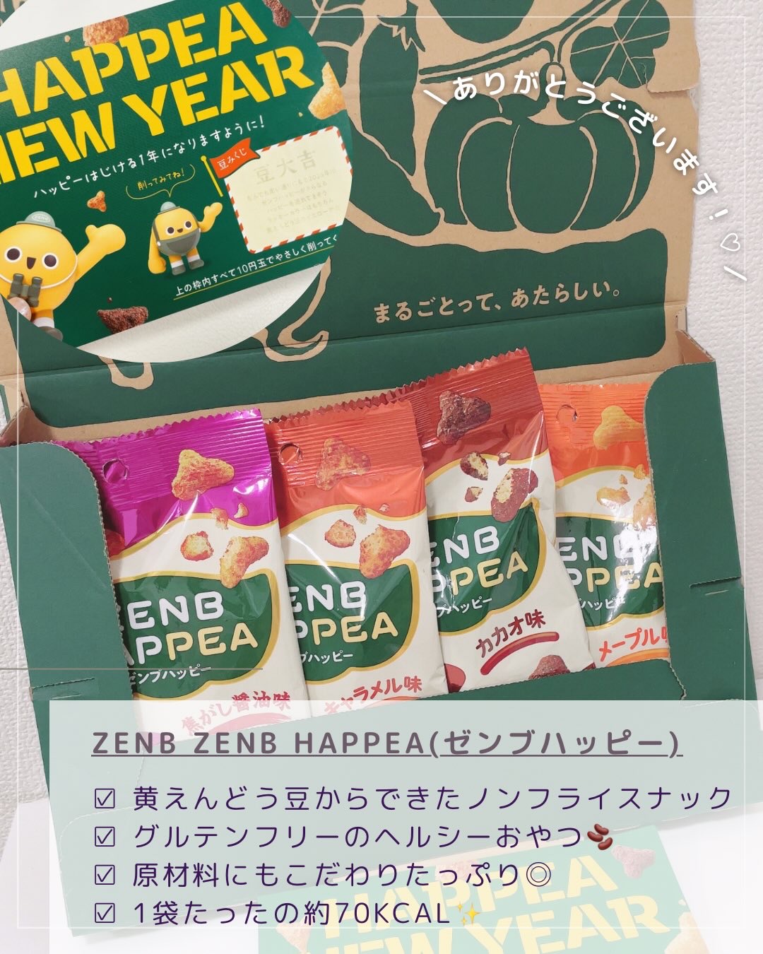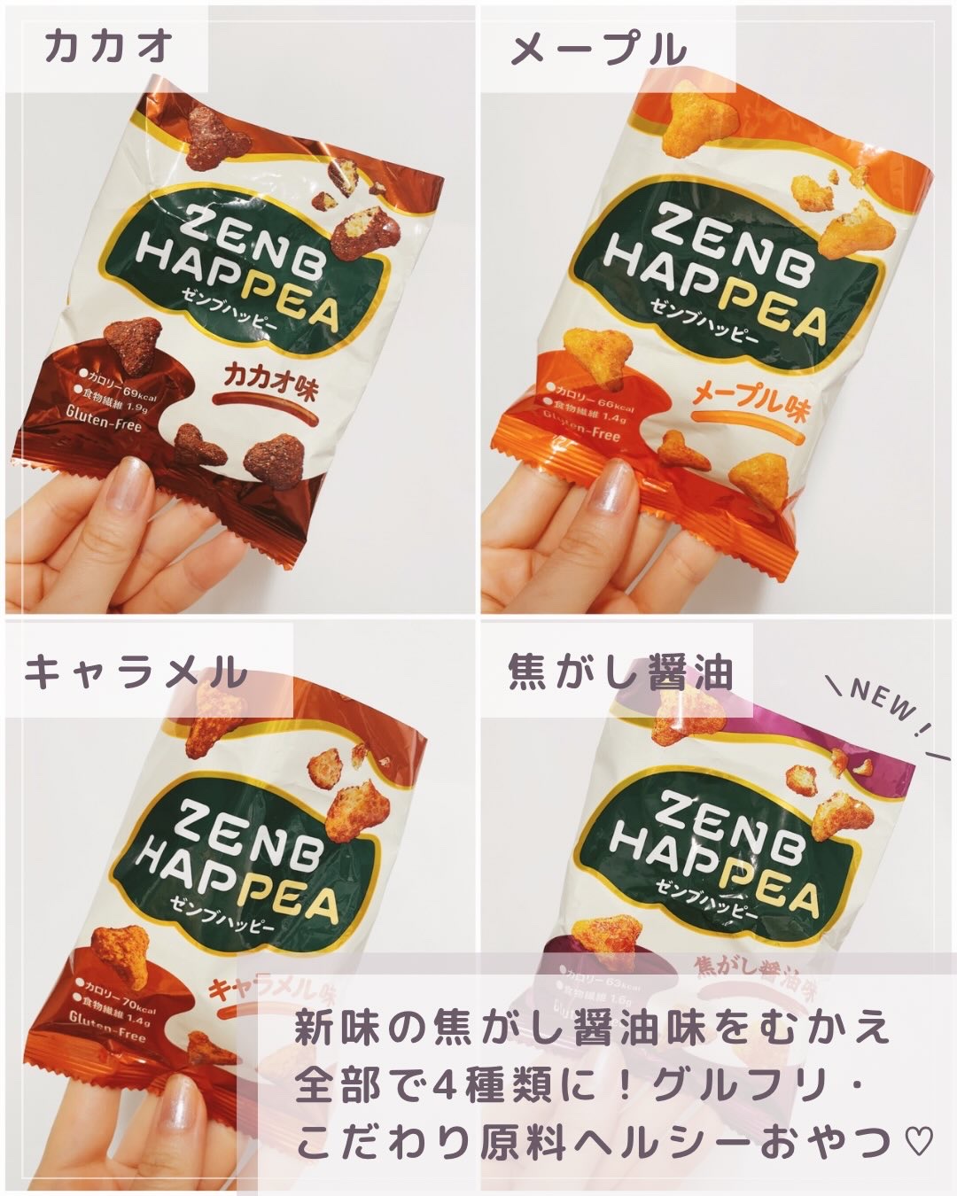 .ザクッと軽やか、やさしい甘さ食べるとちょっとハッピーなおやつ♥.▶ZENBHAPPEA....新商品の「焦がし醤油」を含む、4種類を食べてみたよ!.黄えんどう豆のノンフライのパフスナック。グルテンフリー※※グルテン濃度は10ppm以下。.....