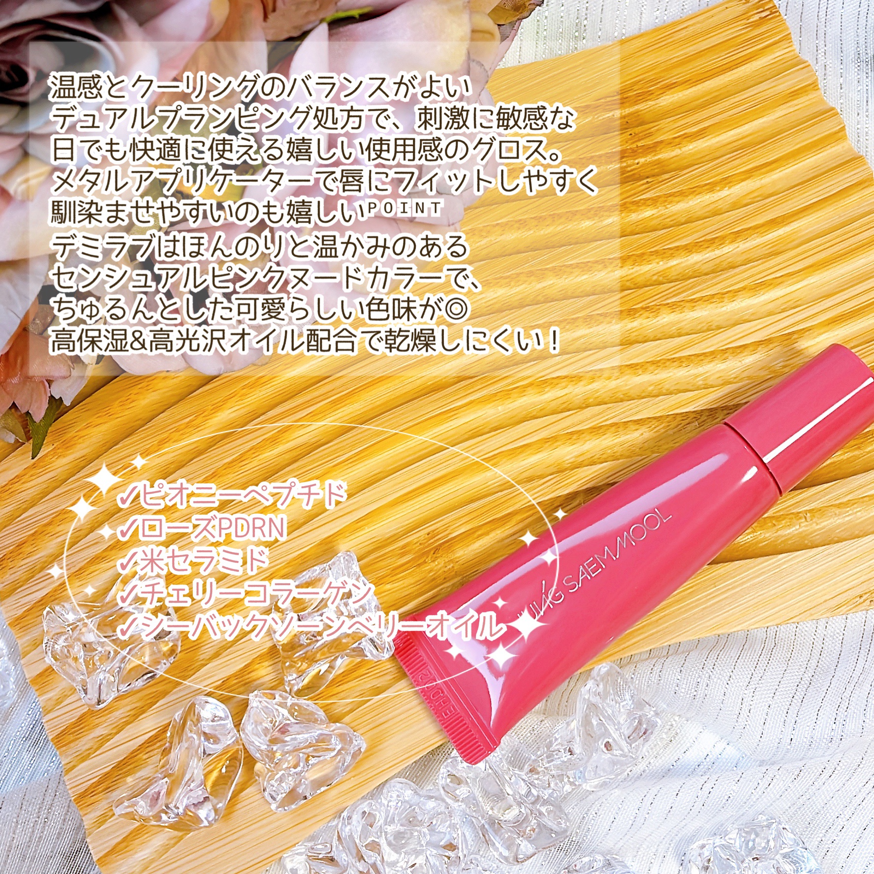 これ、すごくつやつやで水滴のように軽やかに伸びてくれます。 ベースオイルとカラーパウダーの配合バランスを追求した結果、この均一に広がる薄膜とフィット感が実現出来たのだとか💡´- 唇へのフィット感がすごく好きです、これ。 ヒアルロン酸、ローズヒップオイル配合で唇をしっかりと守ってくれるようですね💡´- 私の選んだウォームバタースコッチは、少し大人っぽいくすみのあるコーラルベージュ❤︎.* ベージュのリップってあんまり持っていないというか、挑戦しにくくて……でもこれ本当に可愛い色味🥺✨ 他の色味も可愛いものばかりですし、きっと似合うものがあると思います☺️