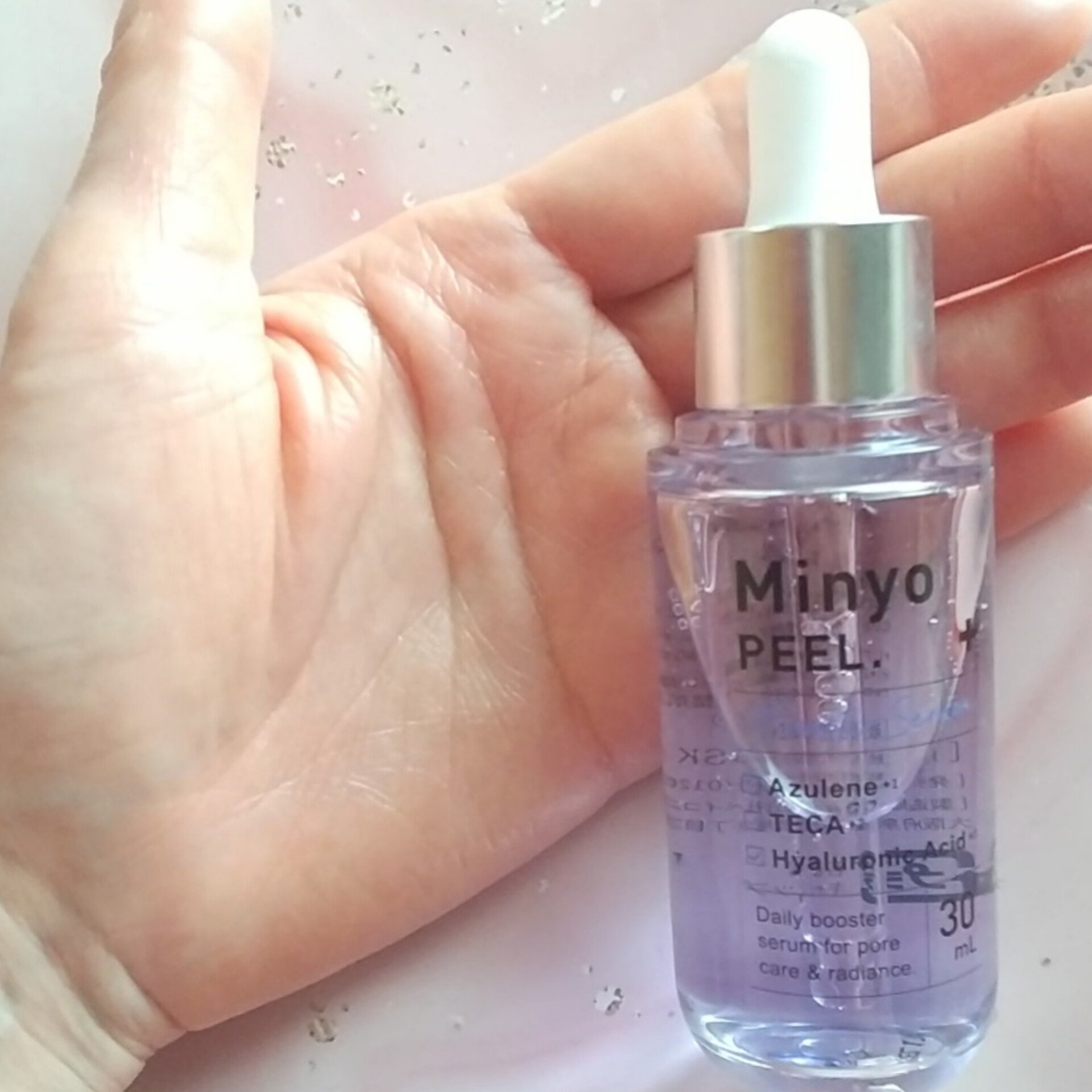 <商品名>MinyoPEEL.(ミニョピール)毎日のスキンケアに “つるん”とした手触りをプラスしたい人に、 MinyoPEELの導入美容液。青色のとろみのあるテクスチャーが肌にすっと広がり、べたつきにくいのにし...