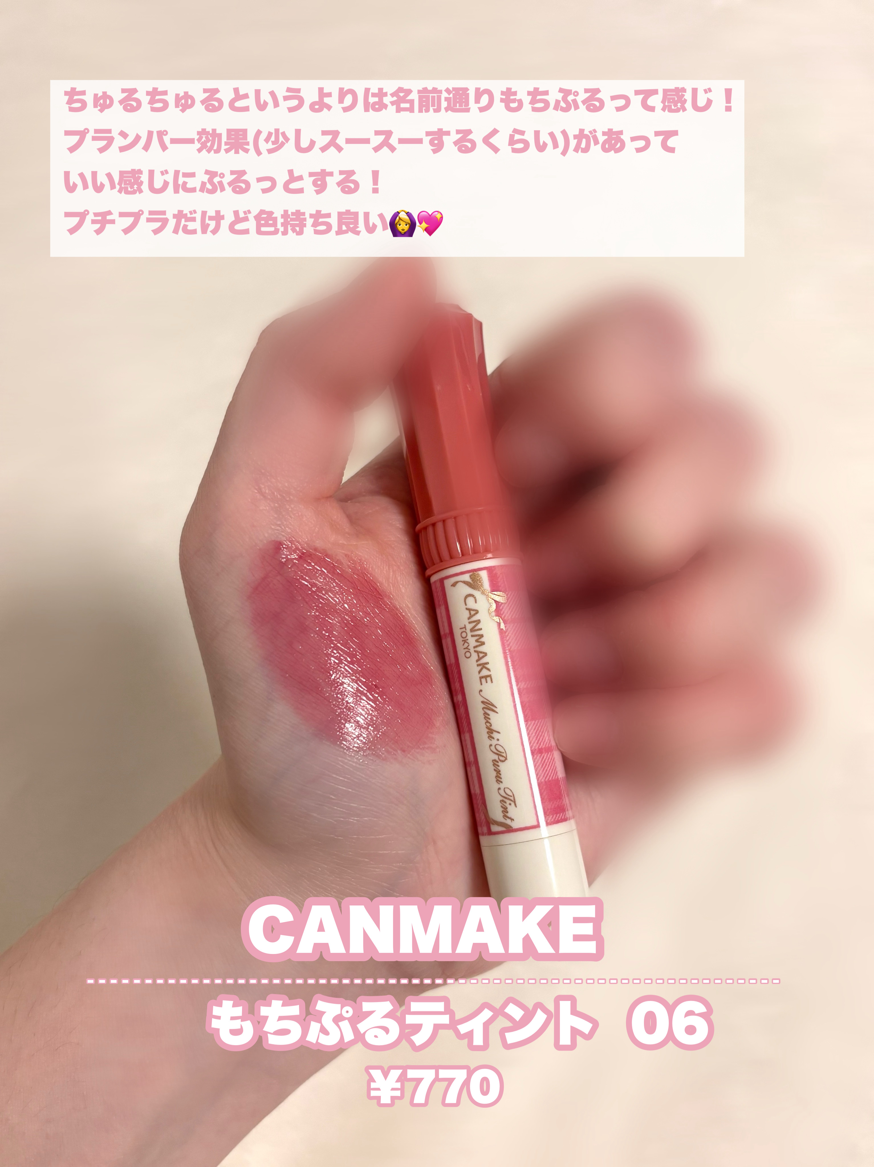 キャンメイクむちぷるティント¥77002モモ血色感のあるニュートラルピンク。イエベ春さんやブルベ夏さんにおすすめです。06ラズベリーケーキ大人っぽい青みモーヴピンク。1st.2nd共にブルベさんにおすすめです。07フルーツオレ使いやすい白みコ...