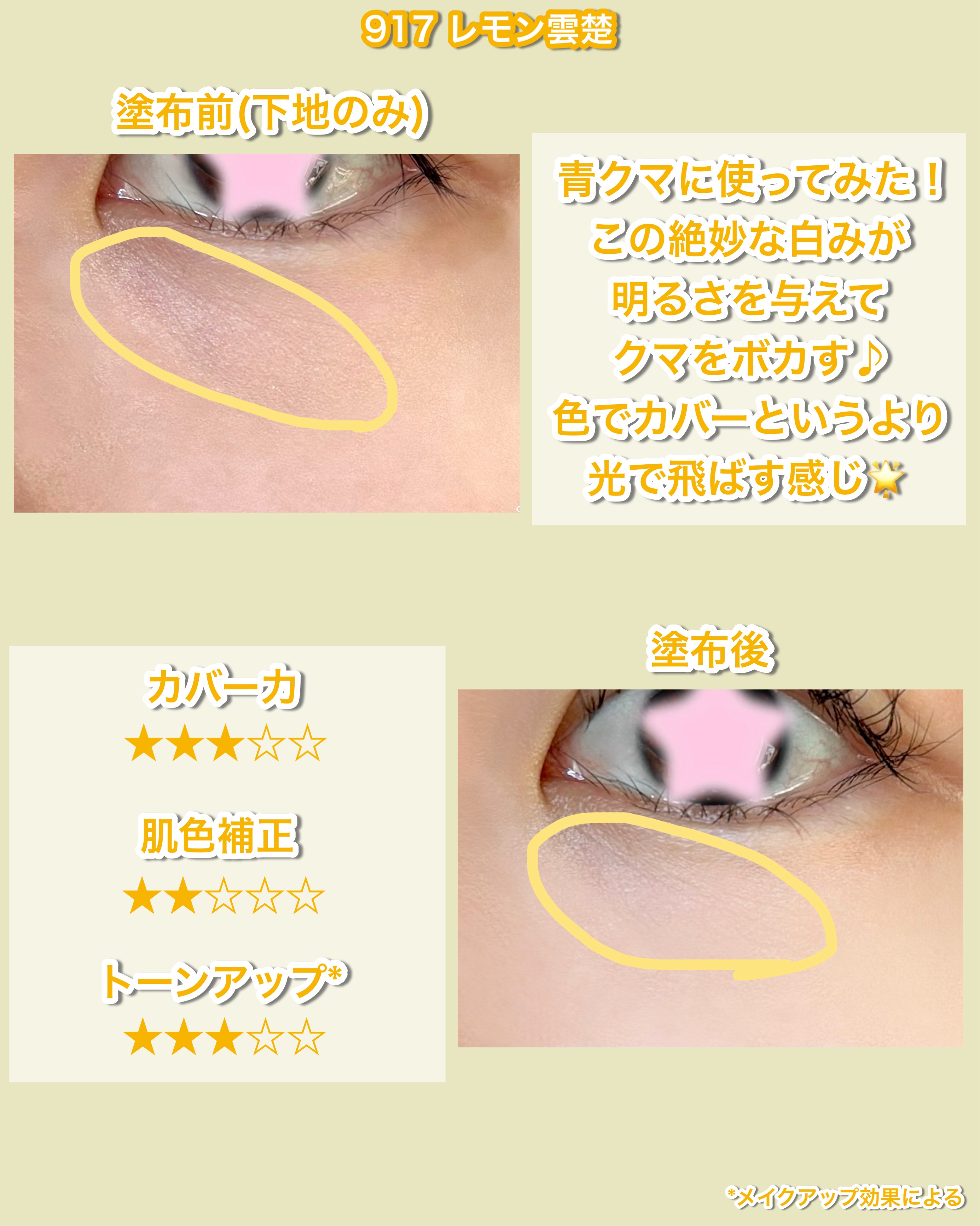 このご時世なので今回もネットで購入💦 カラー選びにちょっと苦戦😭 標準色より明るいファンデを使ってる方はこの色で大丈夫だと思います!! クマがけっこうヒドイですが このコンシーラーはカバーして隠すというより 付けたところがパッと明るくなり 光で飛ばして隠してくれる印象です✨ テクスチャーはみずみずしく 伸びがすごくイイ!!少量でOK!! 薄付きなのにカバー力があって、なんとも不思議😆 最近はファンデとして愛用してますが、 崩れにくく乾燥もしないので大好き💖 コンシーラーとして使った時と比べても伸びがイイし、厚塗り感も出ないので最高です😆 カバー力も程良い(毛穴の黒ずみが適度に隠れる程度)です!! これを使うようになってから もうリキッドファンデは買わなくなりました笑 コンシーラーだと思うと大きいけど、 メイク直しのファンデとして持ち歩きたい方にはコンパクトでイイかもしれません✨ まだ使ったコトないよーという方に ぜひ試してほしいと思うぐらいオススメな商品です🥰