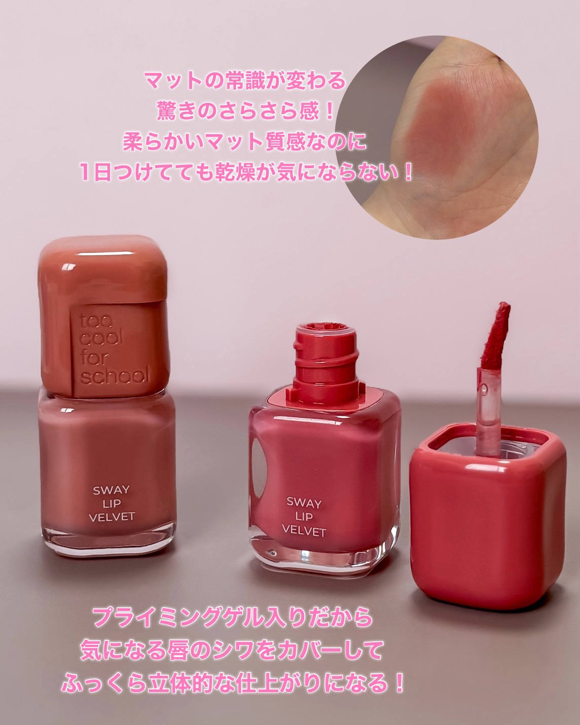 べたつかずふんわりとしたマット質感で、冬のメイクにぴったりのベルベットリップtoocoolforschoolSwayLipVelvetがかわいいすぎた💗❄️マットリップって乾燥が気になるイメージだったんだけど、これはベルベットのようなすべすべ...