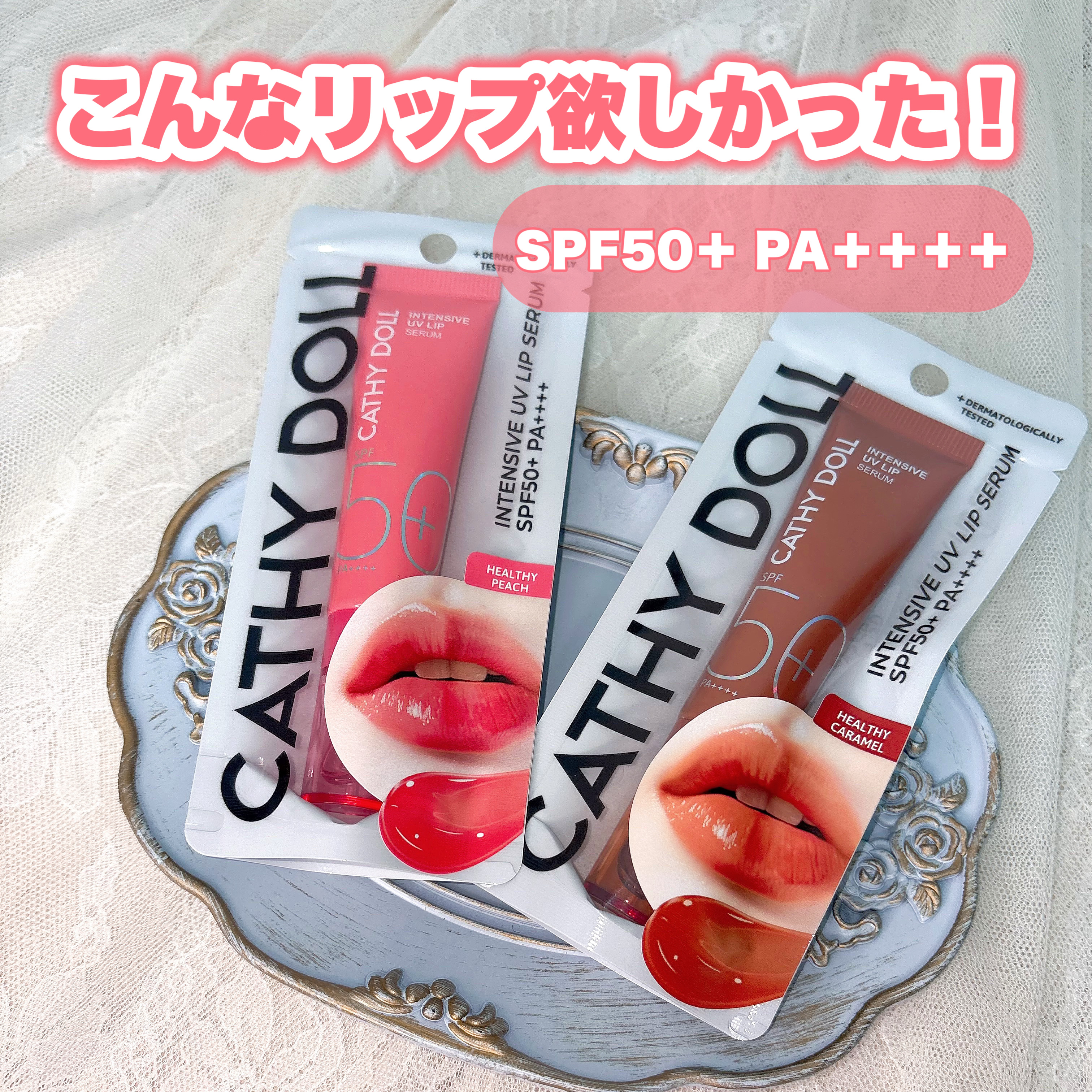 - 1. 紫外線ダメージをブロック 紫外線ダメージを防ぎながら、唇を美しく見せるUVカットリップセラム。 シミやそばかすの原因となる紫外線B波(UVB)と、肌の奥深く(真皮)まで到達する紫外線A波(UVA)をしっかりブロック。 紫外線や乾燥によって硬くなりやすい唇にうるおいを与え、すこやかに整えます。 2.セラミドがバリアを高めて潤いキープ 唇はバリア機能が弱いため、バリアの主成分であるセラミドを補う必要があります。 また、油分を作り出す皮脂腺がほとんどない唇には、抱えた水を逃がさずフタの役割をする油分も重要です。 「CathyDoll インテンシブUV リップセラム」は、水分を繋ぎ止める3種のセラミド*4 × 13種の植物オイル*2 のうるおい膜で、唇を乾燥から守り荒れやカサつきが起こりにくい環境へ整えます。 高密着のオイルとさらっとした軽いオイルをバランスよく組み合わせることで、ベタつきのない密着感のある仕上がりに。 さらに、「ビタミンC誘導体*5・バクチオール・ヒアルロン酸Na・カンゾウ根エキス」をはじめとした美容保湿成分も配合されており、唇の水分を逃がさず、うるおいで満たします。 3.デイリー使いしやすい自然な血色感 唇になじみやすく、すっぴんでも浮かない透け感のあるシアー発色。 くすみがちな唇に自然な血色感とツヤをプラスし活き活きとした唇へ導きます。 *2 ホホバ種子油、アブラナ種子油、コメ胚芽油、アーモンド油、ブドウ種子油、ツバキ種子油、セイヨウハシバミ種子油、メドウフォーム油、マカデミア種子油、月見草油、アボカド油、カニナバラ果実油、ヒマシ油(すべて保湿) *4 セラミドNP、 セラミドNS、セラミドAP、 セラミドEOP、 セラミドEOS(すべて保湿) *5 テトラヘキシルデカン酸アスコルビル、パルミチン酸アスコルビル(すべて保湿) WEB先行発売:楽天市場(公式認定ショップ:シトラスマーケット) 発売:2026年1月9日(金) 限定発売:全国のドン・キホーテ(一部店舗除く) 発売:2026年1月上旬より順次発売 ※オンラインは楽天市場先行となります。公式通販サイトでの販売に関しては、順次開始となります。 ※オンラインは12時より発売予定。システム上多少の前後がございますのでご了承くださいませ。 ※店舗により取扱開始日程が前後する可能性がございます。