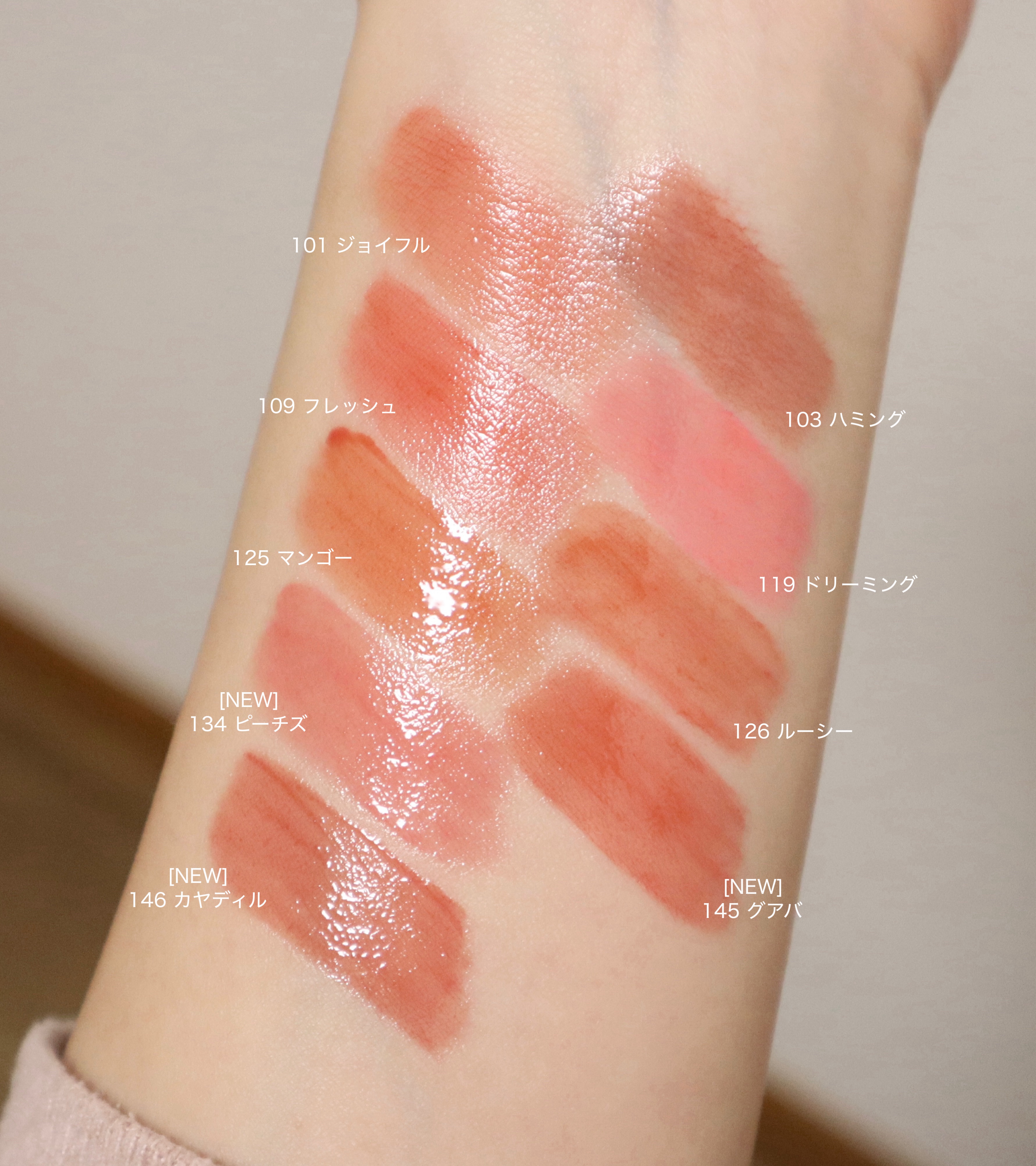 - <101 ジョイフル> 水、リンゴ酸ジイソステアリル、ダイマージリノール酸(フィトステリル/イソステアリル/セチル/ステアリル/ベヘニル)、ジイソステアリン酸ダイマージリノレイル、ノナイソステアリン酸ポリグリセリル-10、オクチルドデカノール、ビスジグリセリルポリアシルアジペート-2、水添ポリイソブテン、セチルPEG/PPG-10/1ジメチコン、ポリソルベート60(小麦由来)、イソステアリン酸ソルビタン(小麦由来)、1,2-ヘキサンジオール、グリセリン、ベヘニルアルコール、(アクリル酸/MA)コポリマーNa、ペンチレングリコール、BG、ポリアクリレート-13、トロメタミン、(アクリレーツ/アクリル酸アルキ ル(C10-30 )クロスポリマー、エチルヘキシルグリセリン、ポリイソブテン、(アクリル酸ヒドロキシエチル/アクリロイルジメチルタウリンNa)コポリマー、スクワラン、デヒドロ酢酸、ステビオシド、香料、フィチン酸、カプリリルグリコール、ジメチコン、水添ロジン酸メチル、水酸化Al、ポリソルベート20(小麦由来)、トコフェロール、ライム果汁、キイチゴ果汁、レモン果汁、マンゴー果汁、フラガリアチロエンシス果汁、アンズ果汁、オレンジ果汁、グレープフルーツ液汁、キウイ果汁、パパイア果汁、[+/-]酸化チタン、黄4、黄5、赤 104(1)、赤227、青1 <102 デューイ> 水、リンゴ酸ジイソステアリル、ダイマージリノール酸(フィトステリル/イソステアリル/セチル/ステアリル/ベヘニル)、ジイソステアリン酸ダイマージリノレイル、ノナイソステアリン酸ポリグリセリル-10、オクチルドデカノール、ビスジグリセリルポリアシルアジペート-2、水添ポリイソブテン、セチルPEG/PPG-10/1ジメチコン、ポリソルベート60(小麦由来)、イソステアリン酸ソルビタン(小麦由来)、1,2-ヘキサンジオール、グリセリン、ベヘニルアルコール、(アクリル酸/MA)コポリマーNa、ペンチレングリコール、BG、ポリアクリレート-13、トロメタミン、(アクリレーツ/アクリル酸アルキル(C10-30))クロスポリマー、エチルヘキシルグリセリン、ポリイソブテン、(アクリル酸ヒドロキシエチル/アクリロイルジメチルタウリンNa)コポリマー、スクワラン、デヒドロ酢酸、ステビオシド、香料、フィチン酸、ジメチコン、水添ロジン酸メチル、水酸化Al、カプリリルグリコール、ポリソルベート20(小麦由来)、トコフェロール、ライム果汁、キイチゴ果汁、レモン果汁、マンゴー果汁、フラガリアチロエンシス果汁、アンズ果汁、オレンジ果汁、グレープフルーツ液汁、キウイ果汁、パパイア果汁、酸化チタン、赤227、黄5、黄4、青1 <103 ハミング> 水、リンゴ酸ジイソステアリル、ダイマージリノール酸(フィトステリル/イソステアリル/セチル/ステアリル/ベヘニル)、ジイソステアリン酸ダイマージリノレイル、ノナイソステアリン酸ポリグリセリル-10、オクチルドデカノール、ビスジグリセリルポリアシルアジペート-2、水添ポリイソブテン、セチルPEG/PPG-10/1ジメチコン、ポリソルベート60(小麦由来)、イソステアリン酸ソルビタン(小麦由来)、1,2-ヘキサンジオール、グリセリン、ベヘニルアルコール、(アクリル酸/MA)コポリマーNa、ペンチレングリコール、BG、ポリアクリレート-13、トロメタミン、(アクリレーツ/アクリル酸アルキル(C10-30))クロスポリマー、エチルヘキシルグリセリン、ポリイソブテン、(アクリル酸ヒドロキシエチル/アクリロイルジメチルタウリンNa)コポリマー、スクワラン、デヒドロ酢酸、ステビオシド、香料、フィチン酸、ジメチコン、水添ロジン酸メチル、水酸化Al、カプリリルグリコール、ポリソルベート20(小麦由来)、トコフェロール、ライム果汁、キイチゴ果汁、レモン果汁、マンゴー果汁、フラガリアチロエンシス果汁、アンズ果汁、オレンジ果汁、グレープフルーツ液汁、キウイ果汁、パパイア果汁、酸化チタン、黄5、赤227、青1 <104 チェリー> 水、リンゴ酸ジイソステアリル、ダイマージリノール酸(フィトステリル/イソステアリル/セチル/ステアリル/ベヘニル)、ジイソステアリン酸ダイマージリノレイル、ノナイソステアリン酸ポリグリセリル-10、オクチルドデカノール、ビスジグリセリルポリアシルアジペート-2、水添ポリイソブテン、セチルPEG/PPG- 10/1ジメチコン、イソステアリン酸ソルビタン(小麦由来)、ポリソルベート60(小麦由来)、1,2-ヘキサンジオール、グリセリン、ベヘニルアルコール、(アクリル酸/MA)コポリマーNa、ペンチレングリコール、BG、ポリアクリレート-13、ト ロメタミン、(アクリレーツ/アクリル酸ア ルキル(C10-30))クロスポリマー、エチルヘキシルグリセリン、ポリイソブテ ン、(アクリル酸ヒドロキシエチル/アクリ ロイルジメチルタウリンNa)コポリマー、スクワラン、デヒドロ酢酸、ステビオシド、香料、カプリリルグリコール、ポリソルベー ト20(小麦由来)、トコフェロール、ライム果汁、キイチゴ果汁、レモン果汁、マンゴー 果汁、フラガリアチロエンシス果汁、アンズ 果汁、オレンジ果汁、グレープフルーツ液 汁、キウ