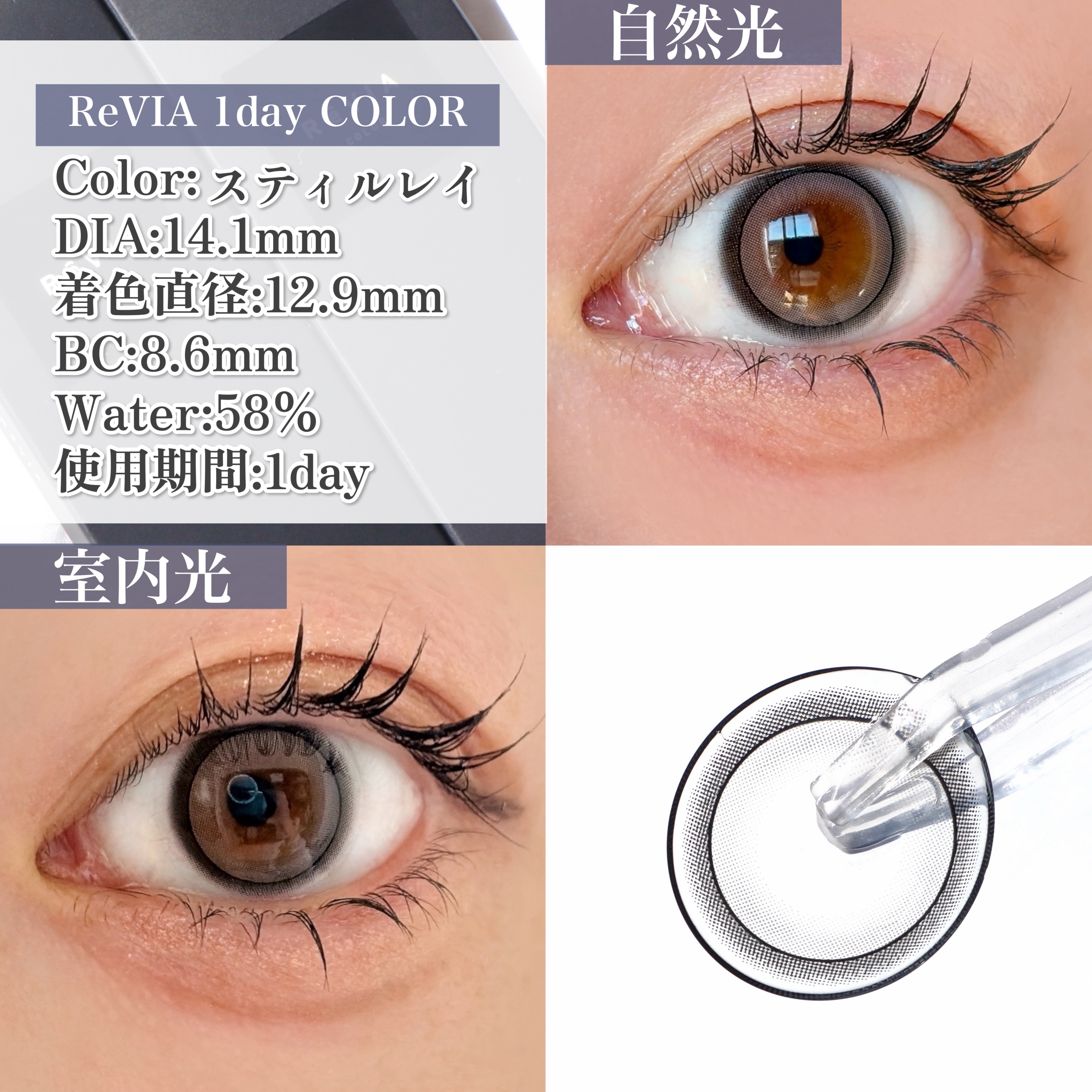 - 10~20代のイメージが強いカラーコンタクトレンズを一新し、幅広い年代の方に愛用頂ける事をコンセプトに掲げ誕生したレンズブランド。 レンズ直径14.1mmを採用し、自然な美しい瞳になれるようにデザインやイメージごとに着色直径を変えたレンズラインナップ。 度数(PWR):全30 度数 ±0.00,-0.50 -5.00(0.25step)、-5.50-10.00(0.50step) DIA14.1mm/BC8.6mm ※2026年1月14日(水)〜パッケージリニューアル <ReVIA 1day 製品リニューアル&アップデート> ReVIA 1dayは、よりシンプルで洗練された、ReVIAらしいパッケージ&ブリスターデザインへと生まれ変わります。 日々の使用感にも寄り添い、瞳にやさしいうるおい成分を新たに配合し、より快適にお使いいただけるようアップデートをいたしました。 ※レンズカラー・デザイン自体に変更はございません。※製品移行期間中は、新旧パッケージが混在する場合がございます。あらかじめご了承ください。