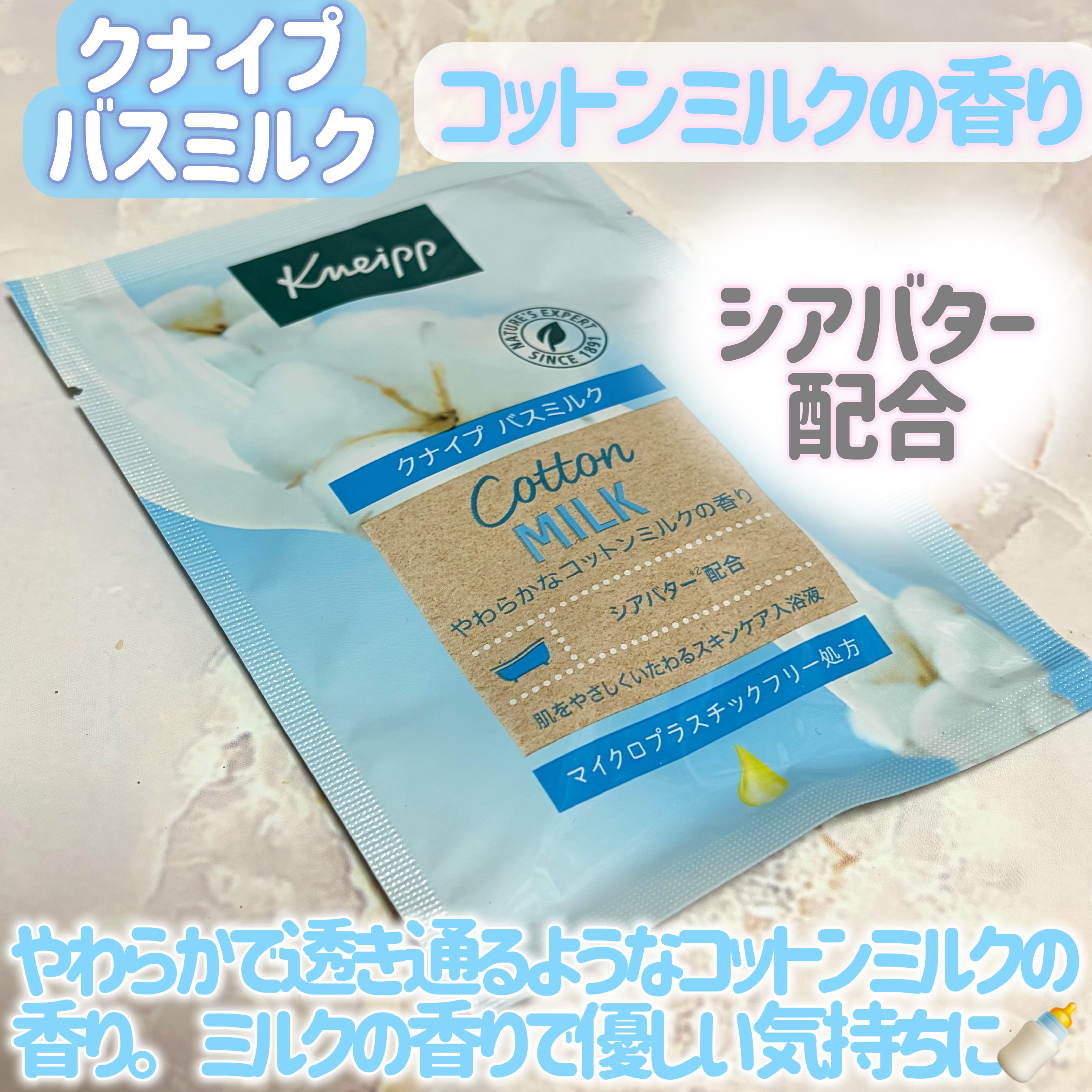 ⳹スキンケア発想の液体入浴剤⳼#クナイプバスミルク#コットンミルクの香り清潔感のある柔らかい甘い香りシアバター(シア脂/天然保湿成分)、スキムミルク配合で乾燥した肌に潤いを与えてくれる#イチジクミルクの香りフルーティーな華やかな香りこちらは天...