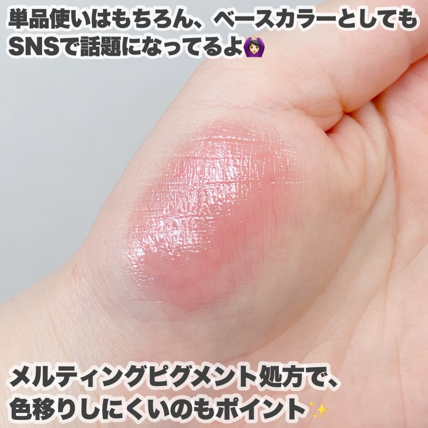 見た目は安定に可愛いし 持ってるだけでテンションあがる🤍 リップパック効果もあり 何と言ってもツヤも発色も凄い🌼 マスクうつりもしますし、持ちは良くないですが 手にスウォッチした際には少し残りました🌼 マスク生活が早く終わることを願って 1本買っておくのがオススメ🤍
