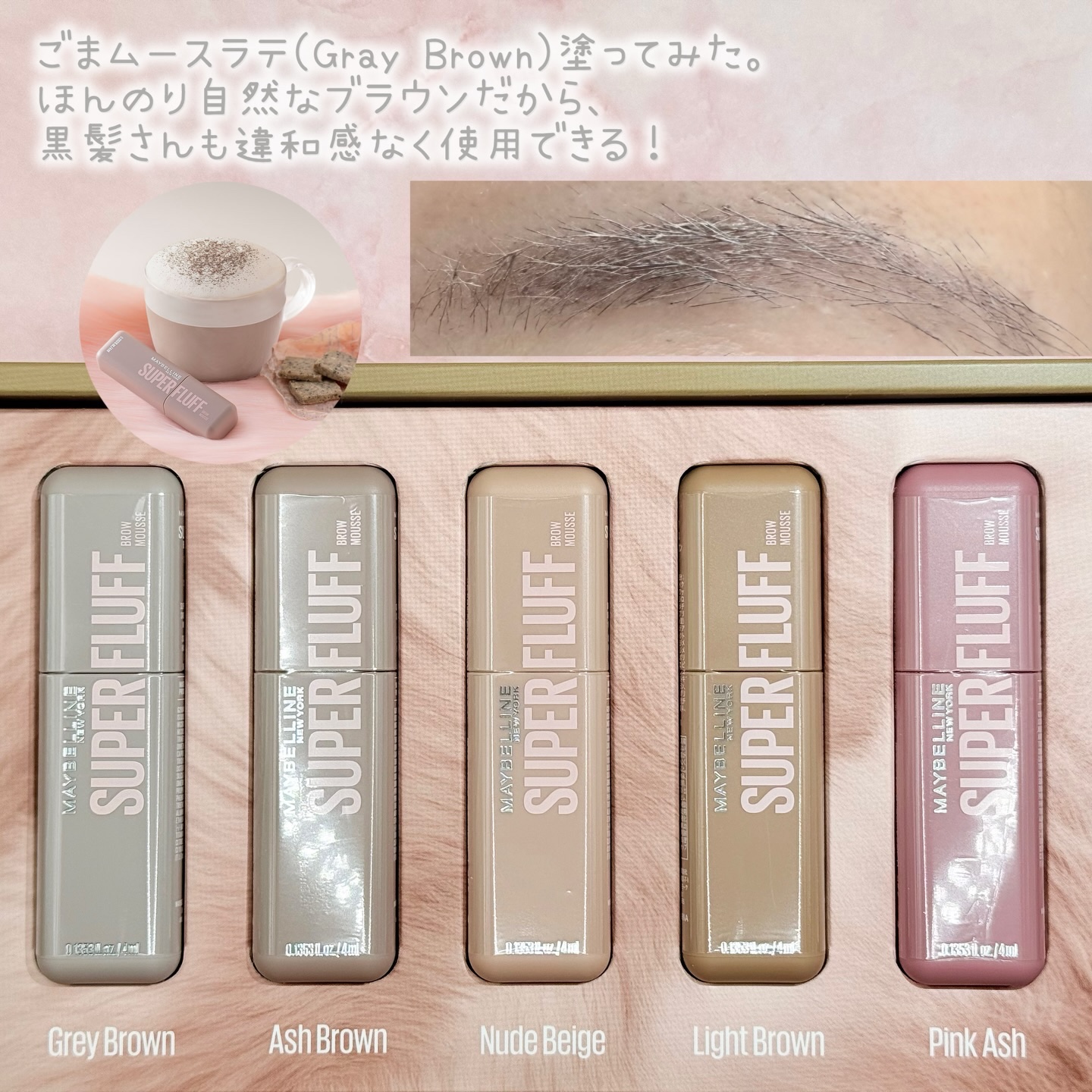 - \NO MORE パリパリ眉!/ 1日*ずっと、ほわっふわ眉。ムラなく色づき、黒眉ミュート ★商品特徴 ①エアリームーステクスチャー 空気とパウダーを混ぜて泡立てたような、軽やかなホイップムーステクスチャーだから、 べったりつかず、固くならない。ふわふわ仕上がり24時間*つづく。 ②テク要らずミニブラシ 先端に向かって細くなるブラシが、細かい毛も余さずキャッチするから、眉頭から眉尻まで均一にムラなく塗れる。 ③全5色展開 なりたい印象に合わせて選べる5色展開。 自眉の黒を消して存在感を抑えたい方にも、髪色に合わせた自然な眉にしたい方にも。 ★カラー展開 -ピンクアッシュ :いちごムースラテ -ライトブラウン :キャラメルムースラテ -ヌードベージュ :バニラムースラテ -アッシュブラウン:ミルクチョコムースラテ -グレーブラウン :ごまムースラテ * メイベリンニューヨーク調べ。個人差があります。