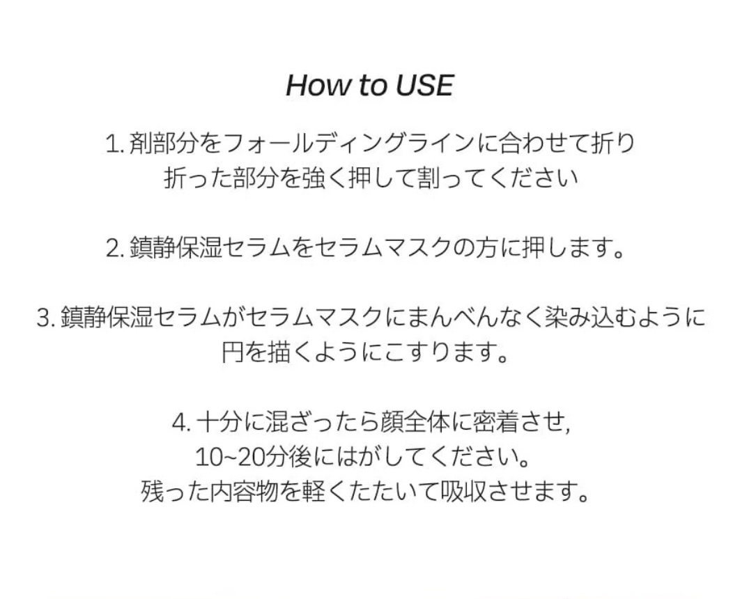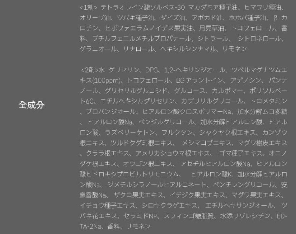 - 【Step1保湿セラム】 ツボクサエキス、DPG、1,2-ヘキサンジオール、グリセレス-26、グリセリン、チャ種子油、ティーツリー葉油、ヒマワリ種子油、ベルガモット果実油、パチョリ油、セイヨウアカマツ葉油、ローズマリー葉油、ニオイテンジクアオイ花油、オレンジ果皮油、セージ油、トレハロース、(アクリレーツ/アクリル酸アルキル(C10-30))クロスポリマー、(C12-14)パレス-12、エチルヘキシルグリセリン、トロメタミン、プロパンジオール、ダイウイキョウ果実エキス、カプリリルグリコール、キサンタンガム、クチナシ果実エキス、デキストリン、EDTA-2Na 【Step2セラムマスク】 水、メチルプロパンジオール、グリセレス-26、グリセリン、ツベルマグナツムエキス、トコフェロール、BG、1,2-ヘキサンジオール、DPG、トレハロース、キサンタンガム、パンテノール、カルボマー、(C12-14)パレス-12、エチルヘキシルグリセリン、トロメタミン、プロパンジオール、ダイウイキョウ果実エキス、カプリリルグリコール、ヒアルロン酸Na、アセチルヒアルロン酸Na、加水分解ヒアルロン酸、ヒアルロン酸ヒドロキシプロピルトリモニウム、ヒアルロン酸クロスポリマーNa、ヒアルロン酸、ヒアルロン酸K、加水分解ヒアルロン酸Na、ヒアルロン酸ジメチルシラノール、ペンチレングリコール、安息香酸Na、フルクタン、ベロニカオフィシナリスエキス、ハマメリス葉エキス、ティーツリー葉エキス、アロエベラ葉水、ツボクサエキス、イタドリ根エキス、オウゴン根エキス、チャ葉エキス、カンゾウ根エキス、カミツレ花エキス、ローズマリー葉エキス、ヒマワリ種子油、ベルガモット果実油、パチョリ油、セイヨウアカマツ葉油、ローズマリー葉油、ニオイテンジクアオイ花油、オレンジ果皮油、セージ油、セラミドNP、スフィンゴ糖脂質、水添レシチン、EDTA-2Na