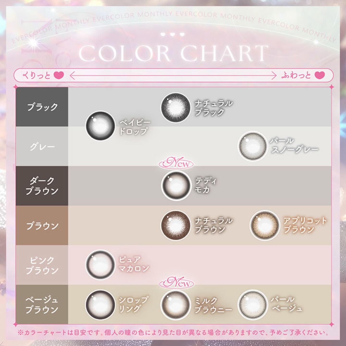- ●瞳にやさしい使い心地、ずっとカワイイ『シリコーンハイドロゲル素材』を採用 エバーカラーマンスリーは、快適なつけ心地を追求したシリコーンハイドロゲル素材を採用しています。高い酸素透過率で角膜に必要な酸素をしっかり届け、うるおいを保つことで、裸眼のような解放感を追求しました。 ※当社の表現する装用感には個人差があります 瞳に馴染むのに盛れる、新色「ミルクブラウニー」「テディモカ」の2カラーが誕生しました。 ■テディモカ(Teddy Mocha) 甘モテ♡色っぽちゅるんオトナのミュートブラウン くりっと甘い盛り感で色気ただよう、ちゅるんな瞳 ■ミルクブラウニー(Milk Brownie) “ナチュ盛り♡ふわちゅるん”ピュアなブラウンベージュ 柔らかなミルクブラウンで甘さたっぷり、ピュアな瞳 カラーコンタクトレンズの不適正使用による眼障害の危険性等などがあります。 ●コンタクトレンズは高度管理医療機器です。不十分な洗浄・消毒など不適切なケアや、長時間・交換期間を超えた装用により、アレルギー性結膜炎、角膜感染症、角膜潰瘍等の重篤な眼障害が発生する危険性があります ●ご使用前に取扱説明書を確認してください 使用上の留意事項 ●眼科医院等を受診してからお求めください ●眼に異常を感じたら直ちにレンズ使用を中止し、お近くの眼科等で診察を受けてください ●医師の指示にしたがってご使用ください ●コンタクトレンズを装用する場合、自覚症状がなくても、眼科医院等での定期検査を受けてください ●レンズに不具合がある場合は使用しないでください
