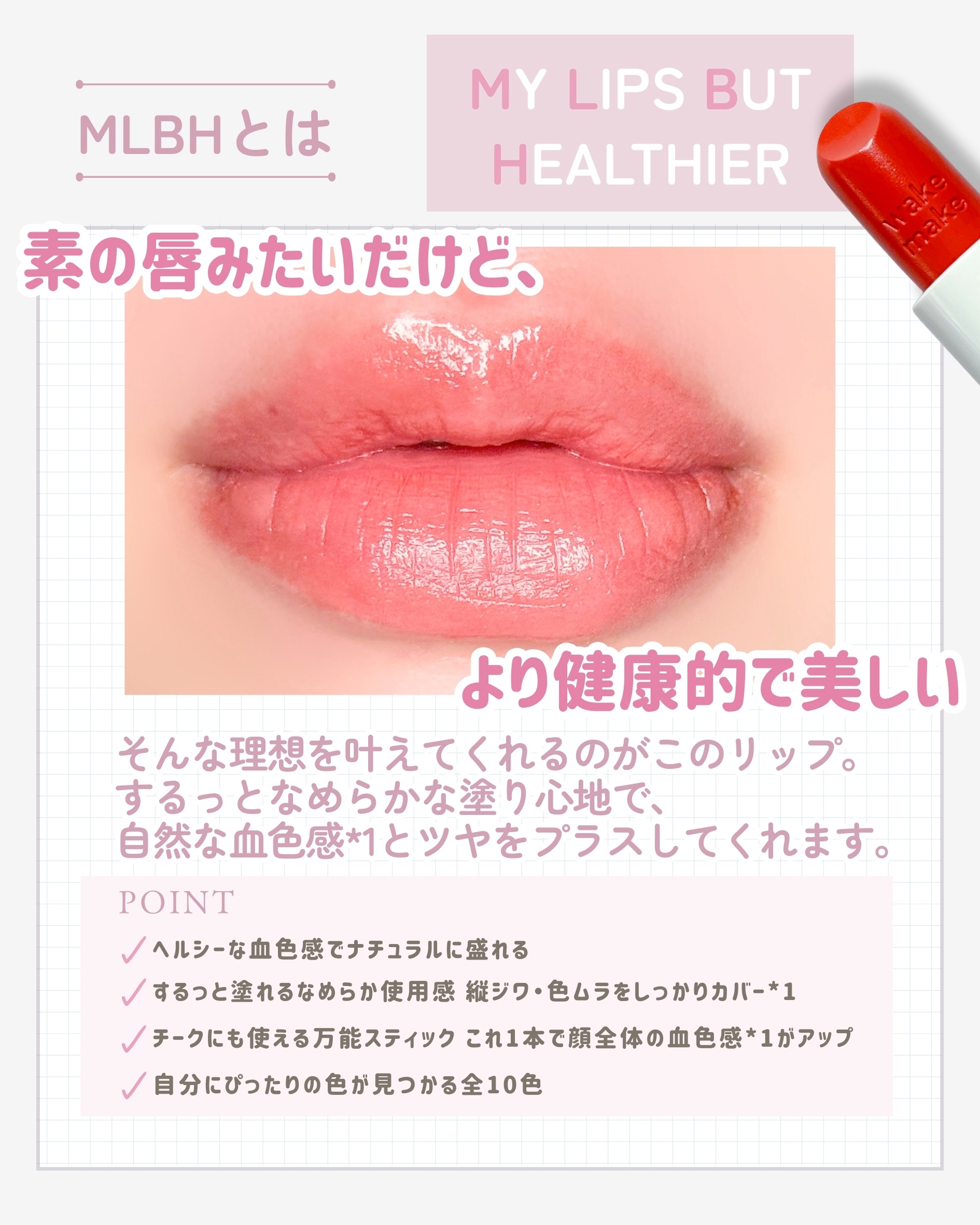 - 塗るたびに、ときめきが走り出す。メイクの楽しさを加速する「#止まらぬリップ」。 肌なじみのいい発色と自然なツヤで今っぽい唇に仕上がる、10色展開。 うるおいをチャージして、ほんのり血色感*¹をじゅわりと与えます。 どんな時でも使いやすい軽やかな塗り心地で、なりたい私を叶える仕上がりに! 【POINT】 ■ヘルシーに魅せる#MLBHリップ 「MLBH =MY LIPS BUT HEALTHIER」。自然なツヤとカラーで、いつもの唇がもっと健康的な印象に見える仕上がりに! ■〝今っぽさ〞を叶える自然なツヤめき ツヤと血色感*¹がほどよく両立。ラズベリーシードオイル*²配合で、うるおいを守りながらツヤめく唇に。 ■軽く均一にフィット。チークにも◎ ひと塗りでムラを防いでフィットし、自然な血色感*¹をプラス。チークにも使えます。 *1 メイクアップ効果による *2 (ラズベリー種子油/コハク酸トコフェロール)アミノプロパンジオールエステルズ(整肌成分)