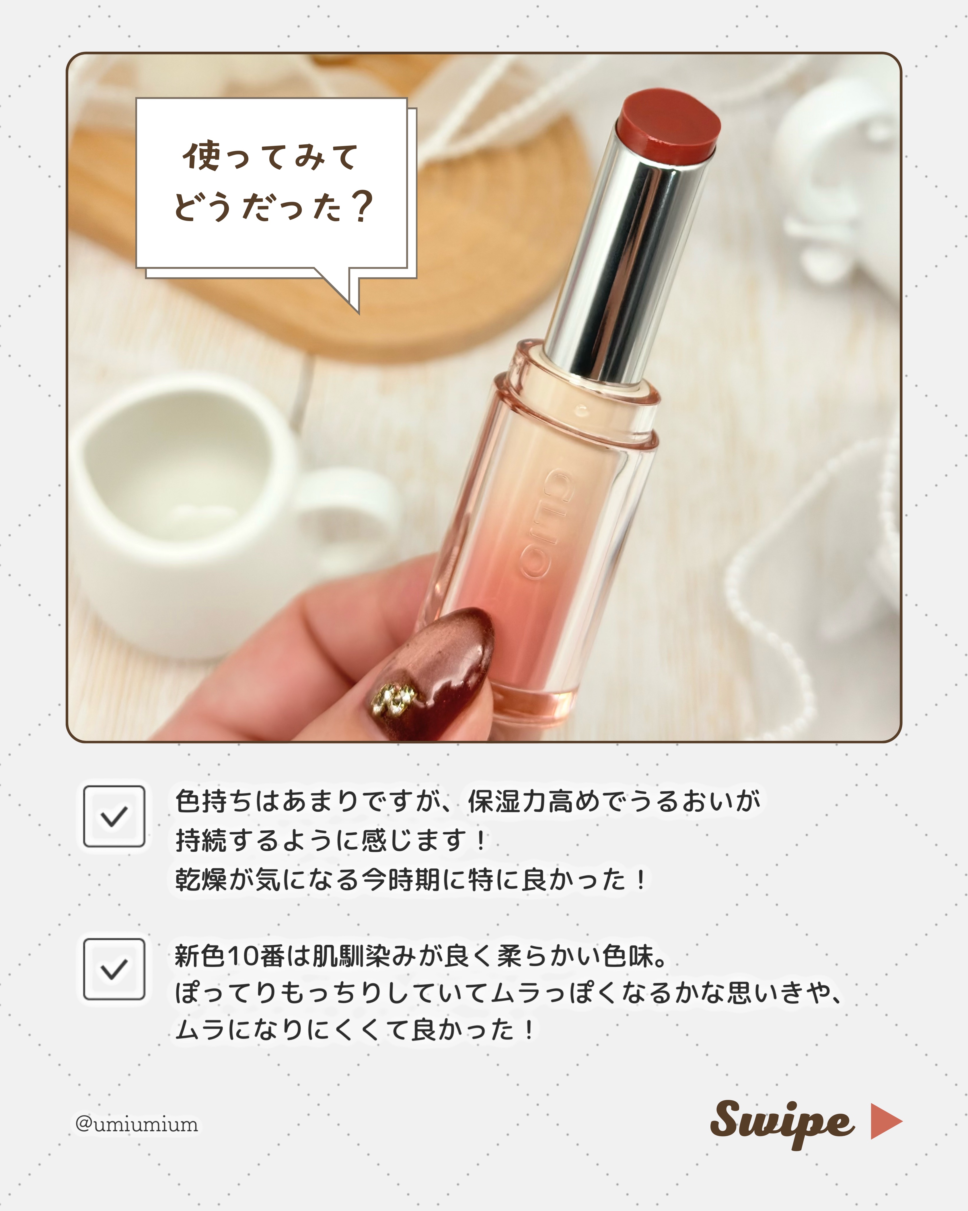 | 口紅・グロス・リップライナーランキング第10位 | ケアしながらほんのり色付けてくれるのが嬉しい✨ | 詳細を見る |
