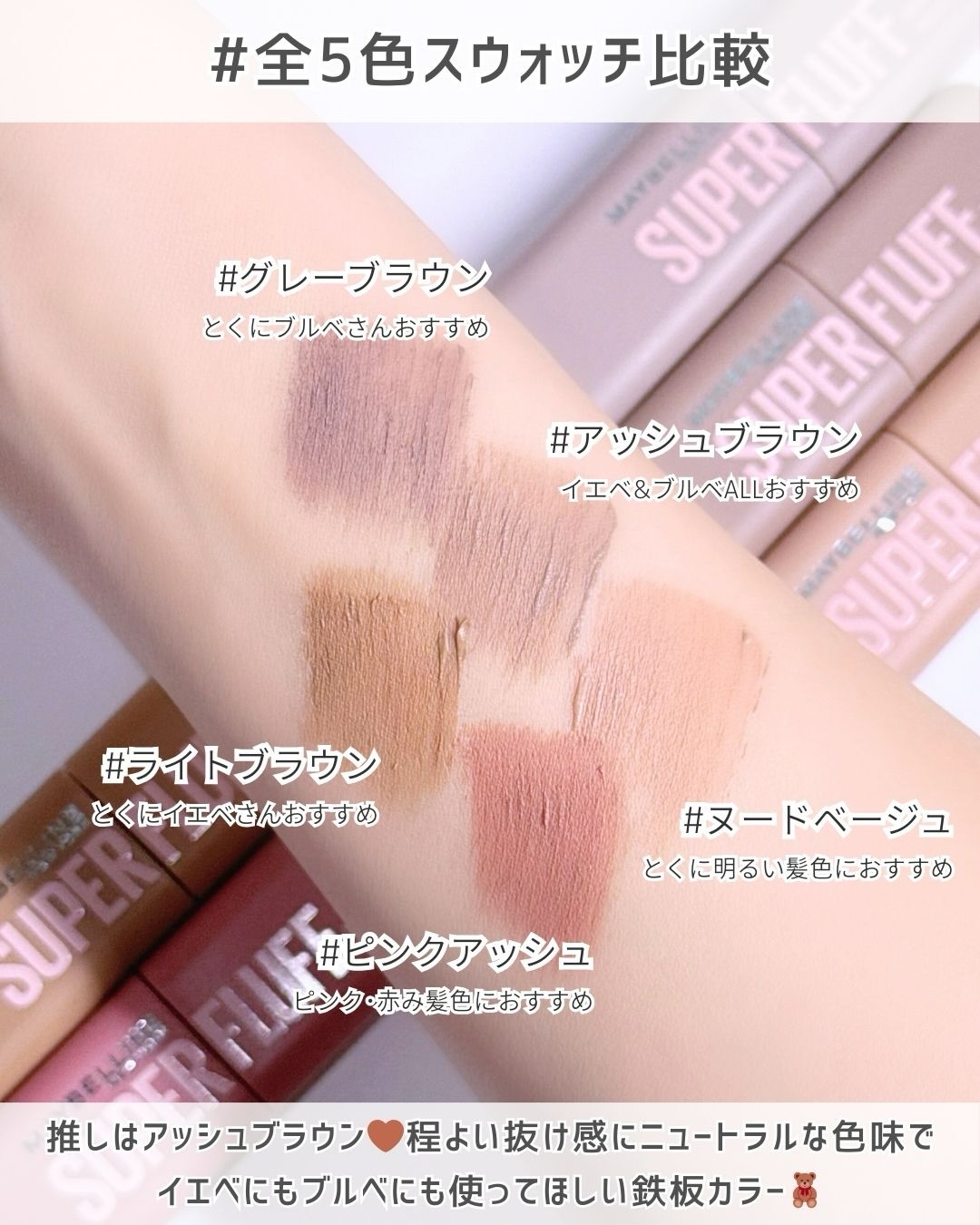 - \NO MORE パリパリ眉!/ 1日*ずっと、ほわっふわ眉。ムラなく色づき、黒眉ミュート ★商品特徴 ①エアリームーステクスチャー 空気とパウダーを混ぜて泡立てたような、軽やかなホイップムーステクスチャーだから、 べったりつかず、固くならない。ふわふわ仕上がり24時間*つづく。 ②テク要らずミニブラシ 先端に向かって細くなるブラシが、細かい毛も余さずキャッチするから、眉頭から眉尻まで均一にムラなく塗れる。 ③全5色展開 なりたい印象に合わせて選べる5色展開。 自眉の黒を消して存在感を抑えたい方にも、髪色に合わせた自然な眉にしたい方にも。 ★カラー展開 -ピンクアッシュ :いちごムースラテ -ライトブラウン :キャラメルムースラテ -ヌードベージュ :バニラムースラテ -アッシュブラウン:ミルクチョコムースラテ -グレーブラウン :ごまムースラテ * メイベリンニューヨーク調べ。個人差があります。