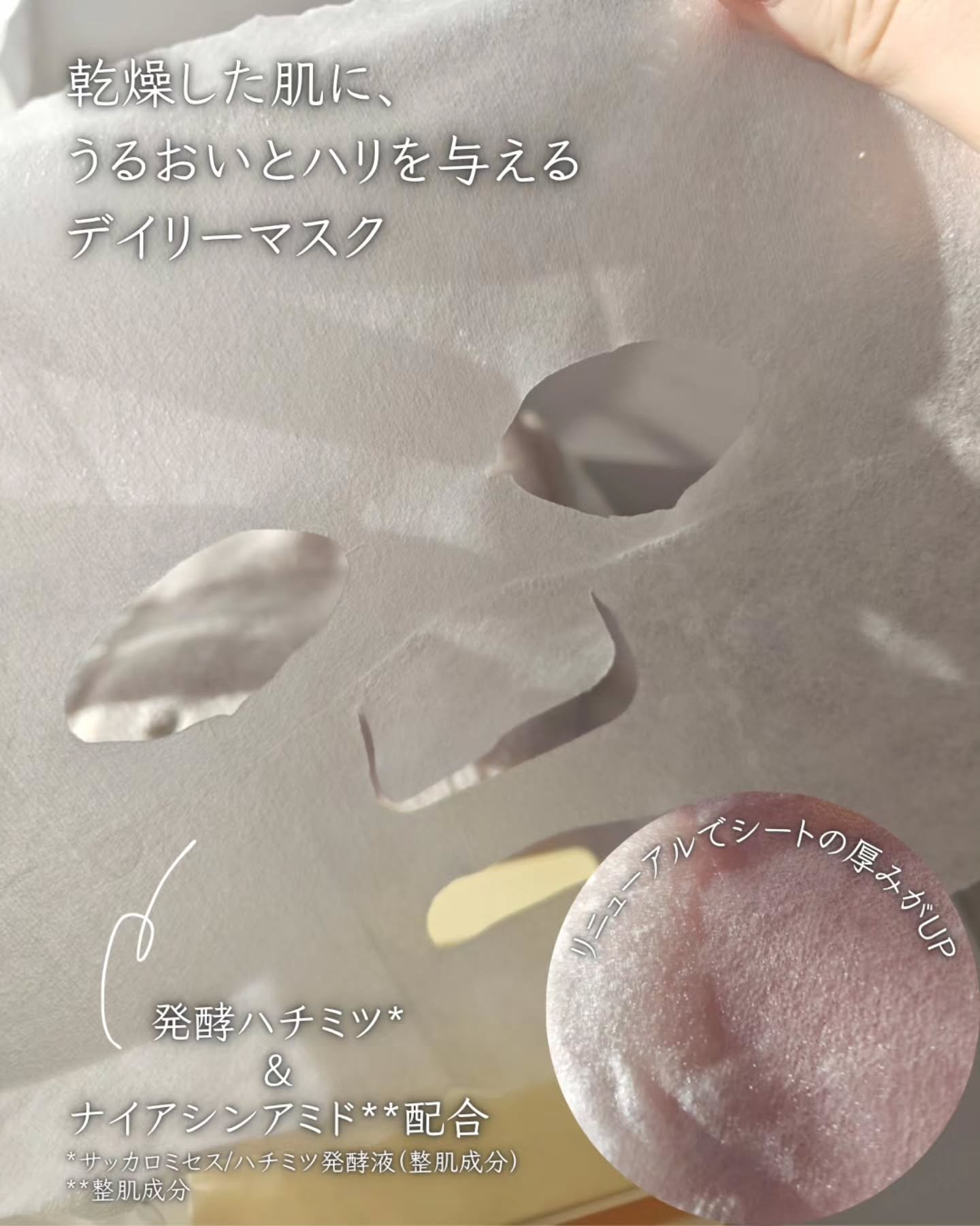 - ■大人気の大容量BOXマスクがリニューアル より中蓋が開けやすい容器をオリジナル開発し、開封するまでフレッシュな状態を保ちつつ、簡単に開封が可能になりました。 また、シートの厚みがアップし、よりフィット感の高いオリジナル形状シートにバージョンアップ! ゆるみ毛穴*³・乾燥ハリ不足肌をうるおいとハリで満たす 発酵ハチミツ*⁴&ナイアシンアミド*⁵。 酵母菌(サッカロミセス)で低温発酵させた低分子の発酵ハチミツ*⁴と3種のハチミツ成分*⁶、 ナイアシンアミド*⁵、韓国発酵エキス*⁷、5種のヒト型セラミド*⁸を配合。 コクのある美容液がぐんぐんなじみ、うるおいとふっくらハリで満たします。 甘さと爽やかさが共存するハニー&シトラスの香り。 ■先行予約:2025年12月24日公式オンラインストア ■全国発売:2026年1月22日 *¹乾燥した毛穴にうるおいを与えて毛穴の目立ちを気にならなくすること *²累計販売枚数:2023年10月〜2025年12月販売実績 *³乾燥による *⁴サッカロミセス/ハチミツ発酵液(整肌成分) *⁵整肌成分 *⁶ハチミツエキス、プロポリスエキス、ローヤルゼリーエキス(すべて整肌成分) *⁷バチルス発酵物(整肌成分) *⁸セラミドNP、セラミドNS、セラミドAS、セラミドAP、セラミドEOP(すべて整肌成分) *⁹肌あれを防ぐ *¹⁰整肌成分 *¹¹ツボクサ葉エキス、ツボクサ葉/茎エキス、ツボクサ根エキス(すべて整肌成分) *¹²角層まで *¹³カプリロイルサリチル酸(整肌成分) *¹⁴うるおいによる肌印象 *¹⁵カンジダボンビコラ/(グルコース/ナタネ油脂肪酸メチル)発酵物、DPG、ヒマワリ種子油(すべて整肌成分) *¹⁶ヒアルロン酸Na、ヒアルロン酸ヒドロキシプロピルトリモニウム、アセチルヒアルロン酸Na、加水分解ヒアルロン酸、ヒアルロン酸、ヒアルロン酸クロスポリマーNa、加水分解ヒアルロン酸Na、ヒアルロン酸K(すべて整肌成分) *¹⁷ナイアシンアミド、シアノコバラミン、デヒドロコレステロール(ビタミンD)、トコフェロール(ビタミンE)(すべて整肌成分) *¹⁸ブランドシリーズ累計