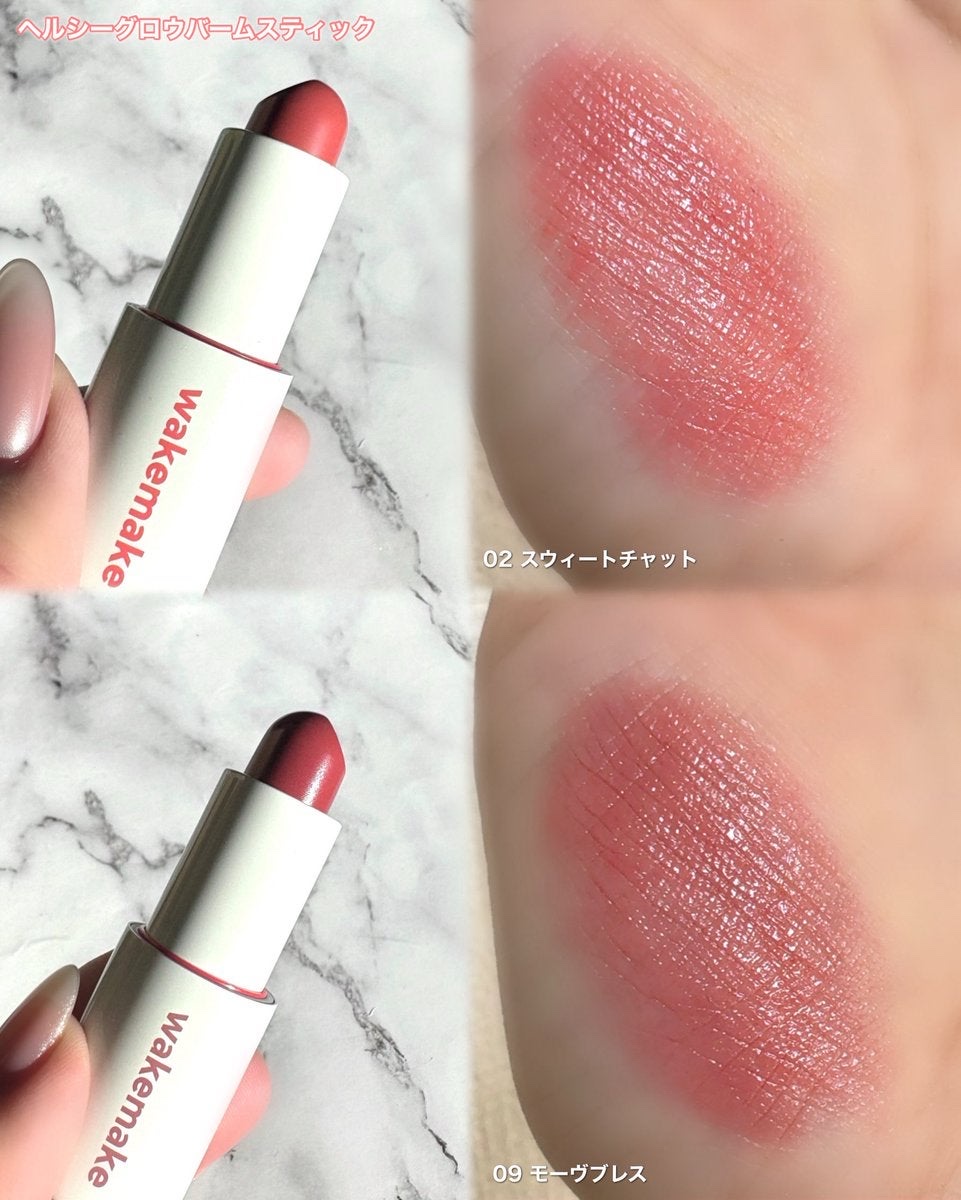 wakemakeHEALTHYGLOWBALMSTICK02スウィートチャット09モーヴブレスwakemakeは4月末からリブランディングしてロゴが小文字に!パケも可愛い🤍Amazon・全国バラショ(一部店舗除く)で販売中!唇がキレイに見える...