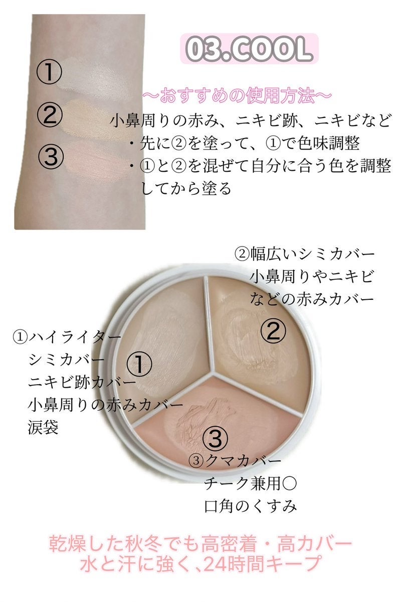 - クマからニキビ跡、シミまでこれ1つでカバー。 3色タイプだからこそ、気になるところや肌色を選ばずにご使用いただけます。 リキッドタイプを圧縮した高濃度バームのため高カバー高密着*¹を実現。 コンシーラーだけでなくコントアとしても使用可能です。 *1メーカー比