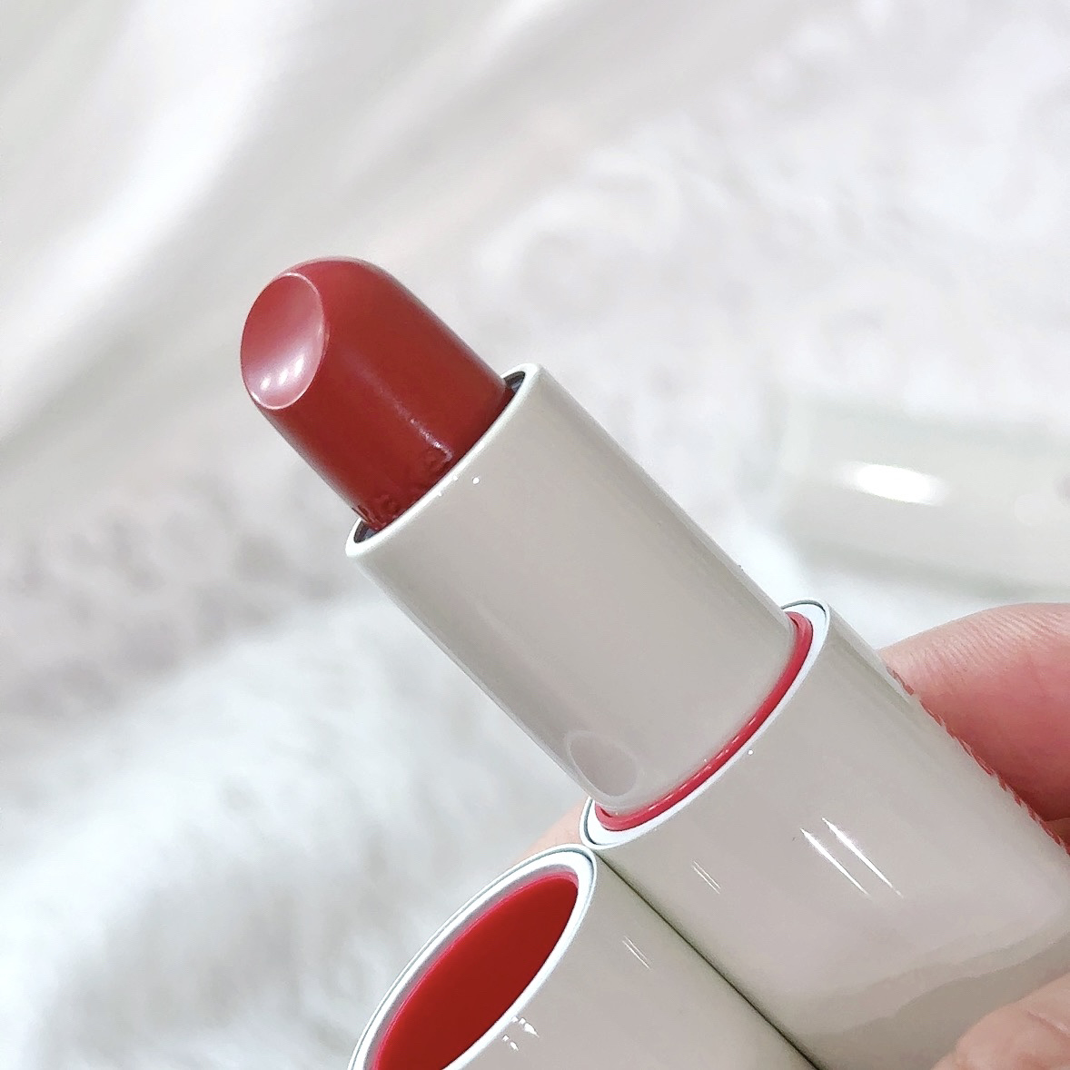 どちらも透明感のある発色で潤みのあるナチュラルな仕上がり🫶 塗ってみるとパール感はそこまでなくて派手になり過ぎない印象😌光に当たるとキラキラ光るから可愛い💄 レッドフレークは優しい赤色にシルバーパール入りのリップ コーラルスノーはヌーディなオレンジカラーにゴールドパール入りのリップ 動画で見るとパール感伝わりやすいかも✨️ꪔ̤̮