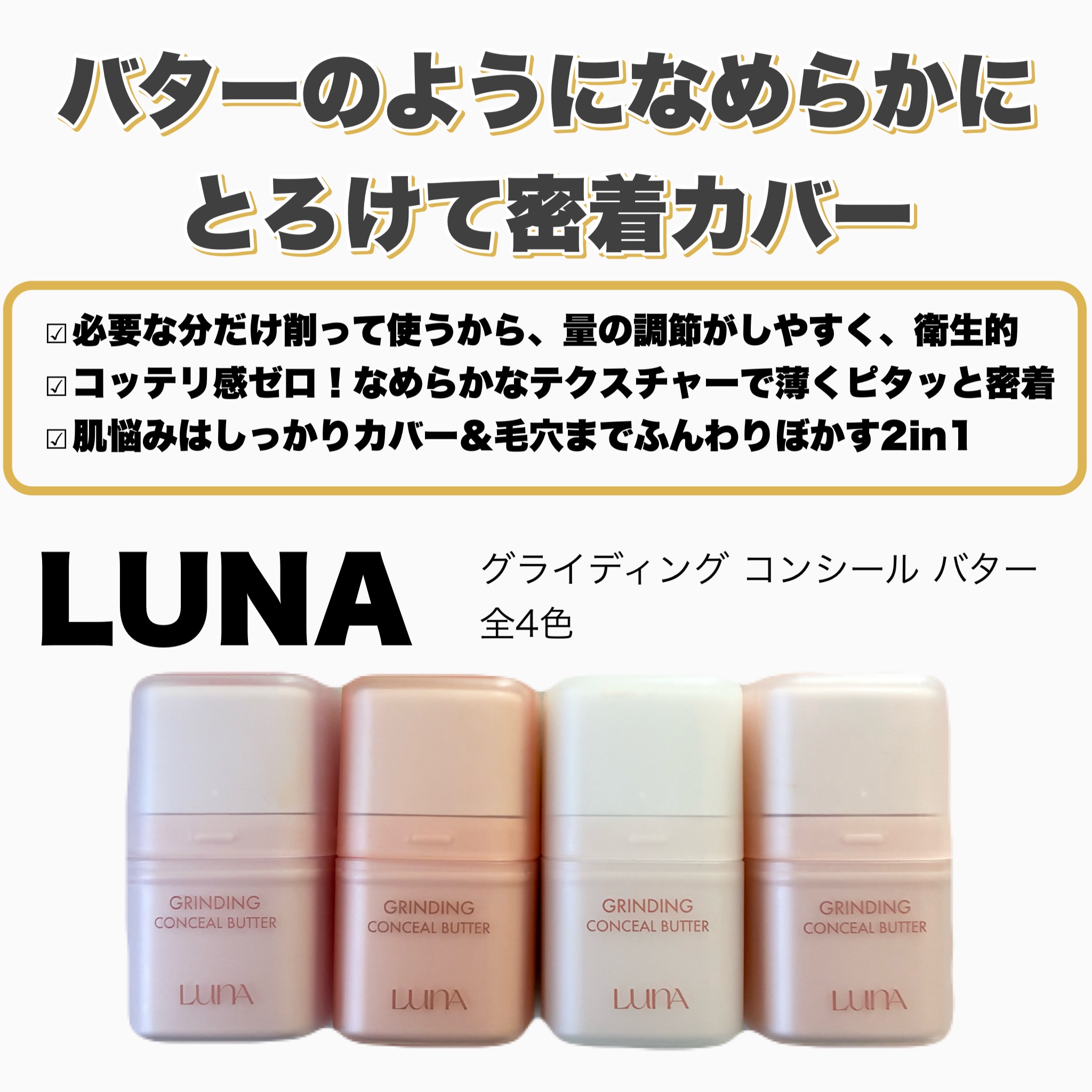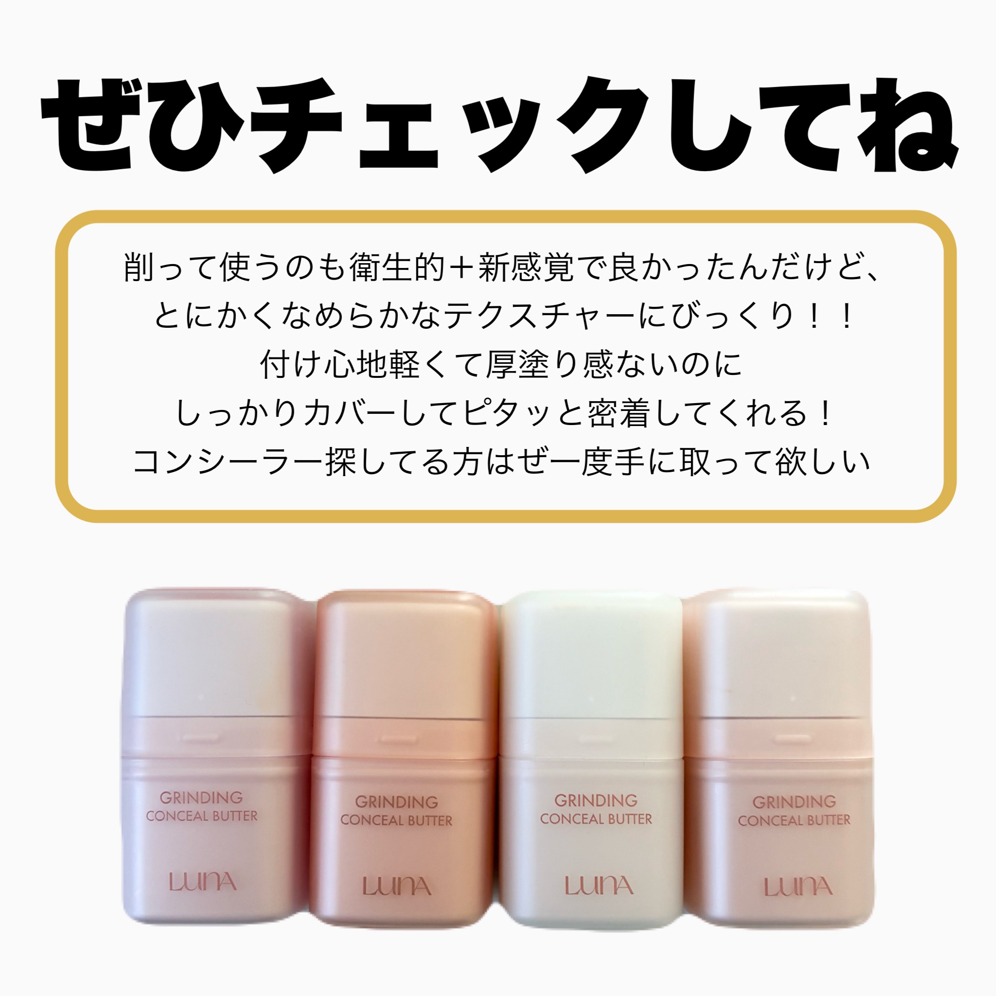 LUNAの削り出す新感覚コンシーラー🍞🧈⚜️LUNAグラインディングコンシールバター00ピンクブライト/01サーモンベージュ/02アイボリー/03ポーセリンカチッと回すと少しずつ削り出てくるバターのようになめらかなテクスチャーのコンシーラーで...