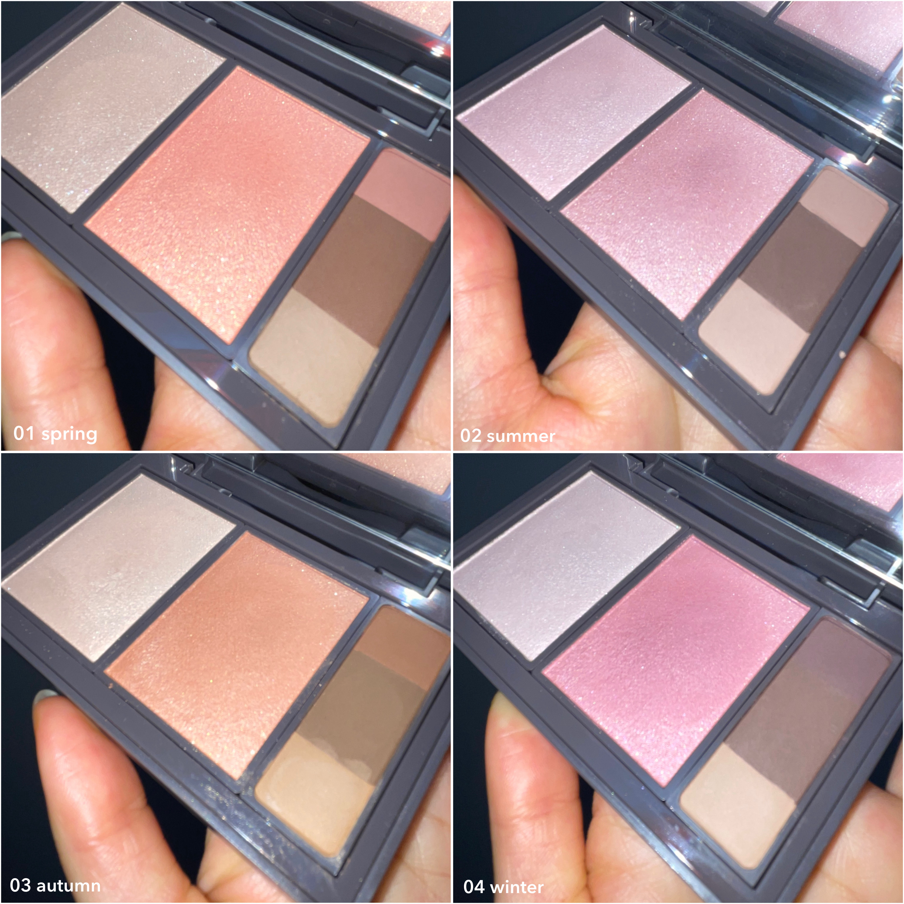 - ハイライト・チーク・アイブロウが1つになった、オールインワンパレット。 すべてアイシャドウともしても使用可能なので、これ一つでメイクが完成します! 春夏秋冬、それぞれのパーソナルカラーにあったカラー展開なので、あなたにぴったりのパレットが見つかる。
