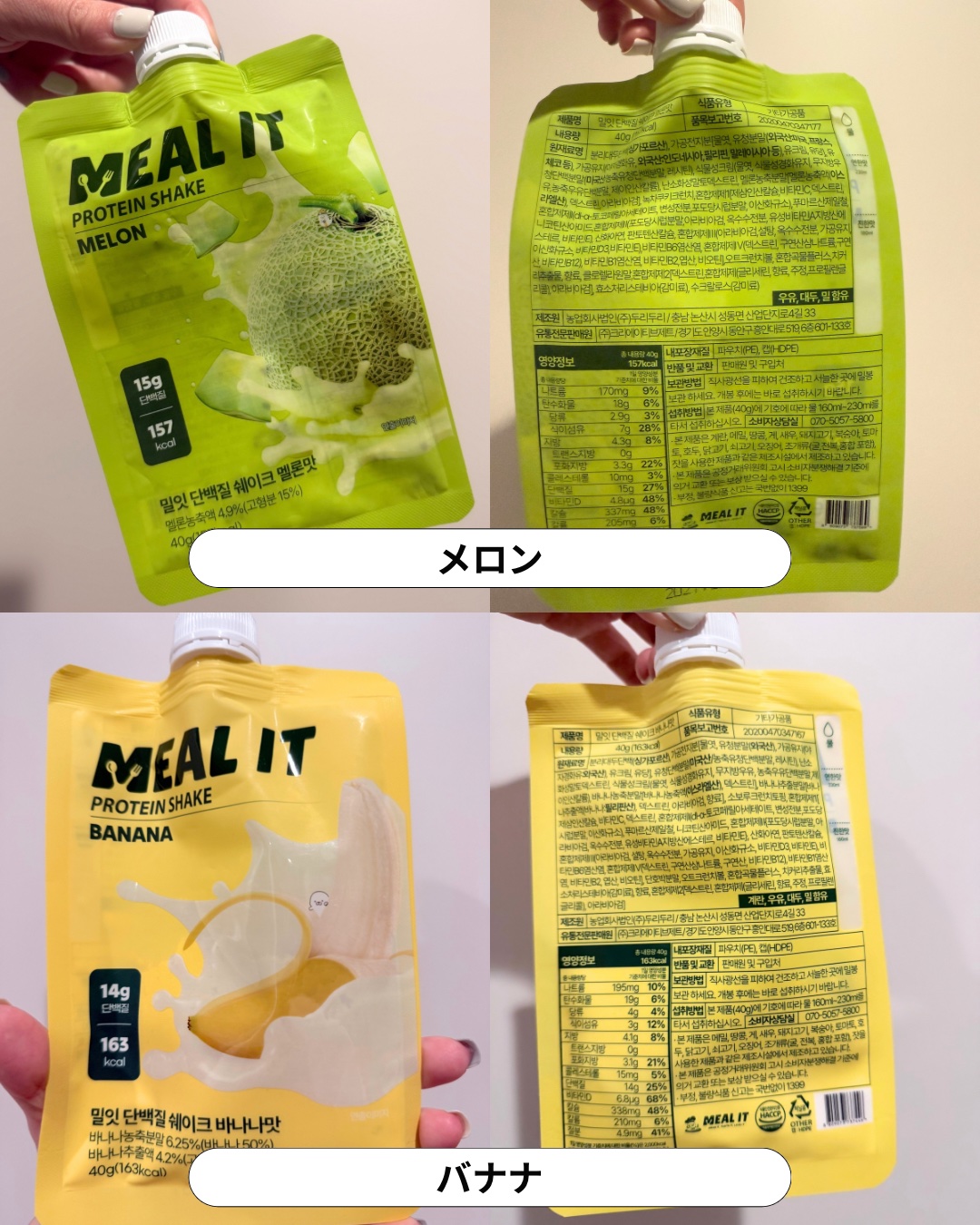 - <チョコ> 分離大豆タンパク、ホエイ粉末(外国産(米国、フランス、チェコなど)90%、韓国産10%]、エリスリトール、バナナ抽出粉末[バナナ抽出液{バナナ(フィリピン産)、ビタミンC}、デキストリン、アラビアガム、香料(プロピレングリコール、香料、トリアセチン、酢酸)ココア粉末(インドネシア産)、チョコレート加工品[チョコレート(ベルギー産)、豆類加工品、ホエイたんぱく粉末、糖類加工品、混合製剤(シェラック、酒精、加工油脂)]、混合脱脂粉乳、香料(バナナの香り)、オオバコ(粉末、酵素処理ステビア、精製塩 <コーヒー> 分離大豆タンパク、ホエイ粉末(外国産(米国、フランス、チェコなど)90%、韓国産10%]、エリスリトール、バナナ抽出粉末[バナナ抽出液{バナナ(フィリピン産)、ビタミンC}、デキストリン、アラビアガム、香料(プロピレングリコール、香料、トリアセチン、酢酸)ココア粉末(インドネシア産)、チョコレート加工品[チョコレート(ベルギー産)、豆類加工品、ホエイたんぱく粉末、糖類加工品、混合製剤(シェラック、酒精、加工油脂)]、混合脱脂粉乳、香料(バナナの香り)、オオバコ(粉末、酵素処理ステビア、精製塩 <バナナ> 分離大豆タンパク、ホエイ粉末(外国産(米国、フランス、チェコなど)90%、韓国産10%]、エリスリトール、バナナ抽出粉末[バナナ抽出液{バナナ(フィリピン産)、ビタミンC}、デキストリン、アラビアガム、香料(プロピレングリコール、香料、トリアセチン、酢酸)ココア粉末(インドネシア産)、チョコレート加工品[チョコレート(ベルギー産)、豆類加工品、ホエイたんぱく粉末、糖類加工品、混合製剤(シェラック、酒精、加工油脂)]、混合脱脂粉乳、香料(バナナの香り)、オオバコ(粉末、酵素処理ステビア、精製塩 <メロン> 分離大豆タンパク、ホエイ粉末(外国産(米国、フランス、チェコなど)90%、韓国産10%]、エリスリトール、バナナ抽出粉末[バナナ抽出液{バナナ(フィリピン産)、ビタミンC}、デキストリン、アラビアガム、香料(プロピレングリコール、香料、トリアセチン、酢酸)ココア粉末(インドネシア産)、チョコレート加工品[チョコレート(ベルギー産)、豆類加工品、ホエイたんぱく粉末、糖類加工品、混合製剤(シェラック、酒精、加工油脂)]、混合脱脂粉乳、香料(バナナの香り)、オオバコ(粉末、酵素処理ステビア、精製塩 <ピスタチオ> 分離大豆タンパク、ホエイ粉末(外国産(米国、フランス、チェコなど)90%、韓国産10%]、エリスリトール、バナナ抽出粉末[バナナ抽出液{バナナ(フィリピン産)、ビタミンC}、デキストリン、アラビアガム、香料(プロピレングリコール、香料、トリアセチン、酢酸)ココア粉末(インドネシア産)、チョコレート加工品[チョコレート(ベルギー産)、豆類加工品、ホエイたんぱく粉末、糖類加工品、混合製剤(シェラック、酒精、加工油脂)]、混合脱脂粉乳、香料(バナナの香り)、オオバコ(粉末、酵素処理ステビア、精製塩