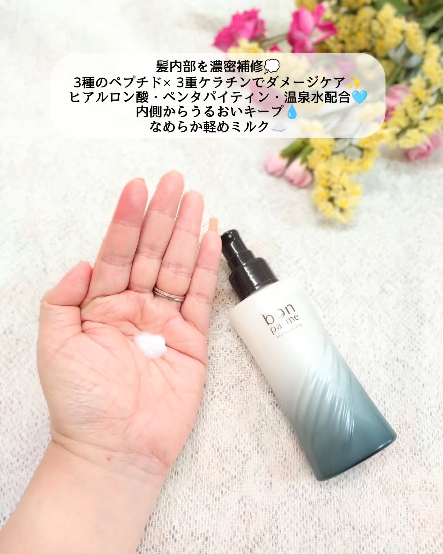 bonparmeボンパルムヘアミルク3種のペプチドと3重ケラチンによる高浸透補修がダメージホールをピンポイントで補修し、失われた密度感を取り戻して弾力のある髪に。ヒアルロン酸、ペンタパイティン、温泉水による多層的保湿・保水成分が内部からのうる...