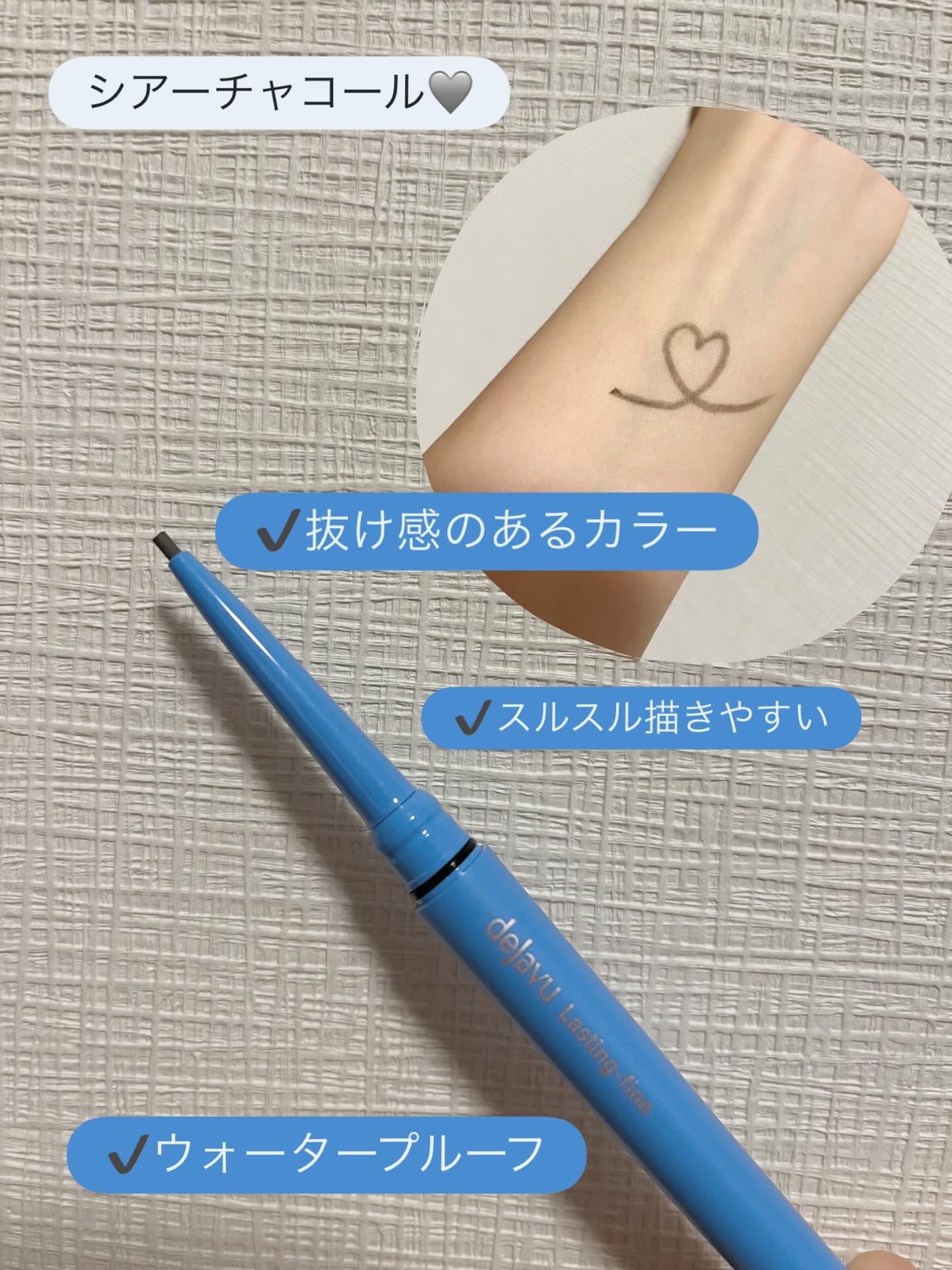 デジャヴュさまからいただきましたデジャヴュ密着アイライナー極細クリームペンシル限定色のシアーチャコールグレーっぽさのあるブラウンで抜け感のある印象スルスルと滑らかな描き心地で滲みにくいし皮脂、涙、汗、こすれに強いのは嬉しいポイント!直径1.5...