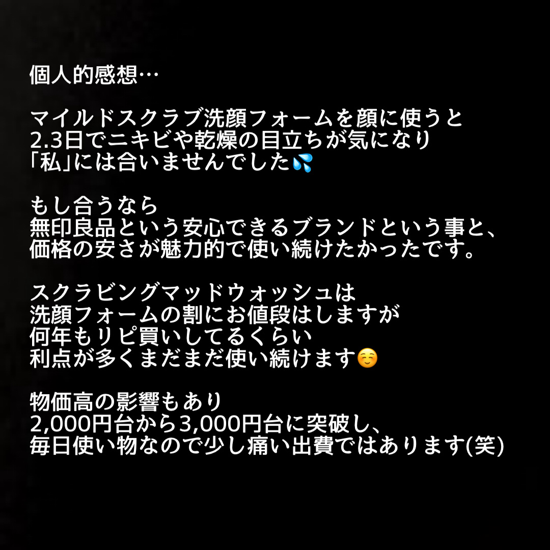 無印良品のスキンケア大好き! 今回は、友達が使ってて気になってたマイルドスクラブ洗顔フォームを買ってみました✨ 細かいスクラブが入っていて 肌への刺激を抑えながらも汚れや角質をオフしてくれます! とにかく安いのが魅力の1つなので (390円で買える) またリピートすると思います🙌