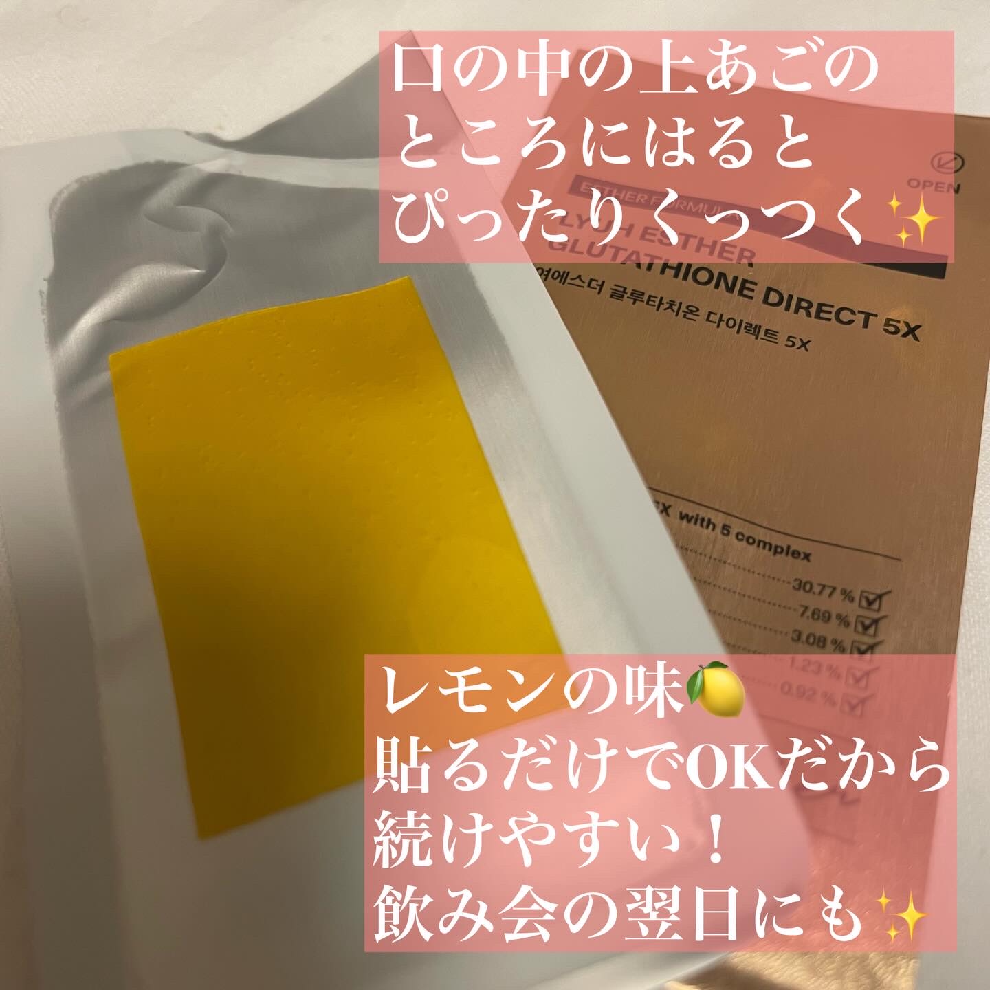 韓国国内でシリーズ累計5億突破の人気シリーズ✨口の粘膜に貼って摂取するフィルムタイプの即効美白ケア**シミ・ソバカスを防ぎメラニンの生成を抑制する事ヨエスターGLTダイレクト5X💎口腔溶解フィルムによる粘膜付着がポイント💡口の中の粘膜にピタッ...