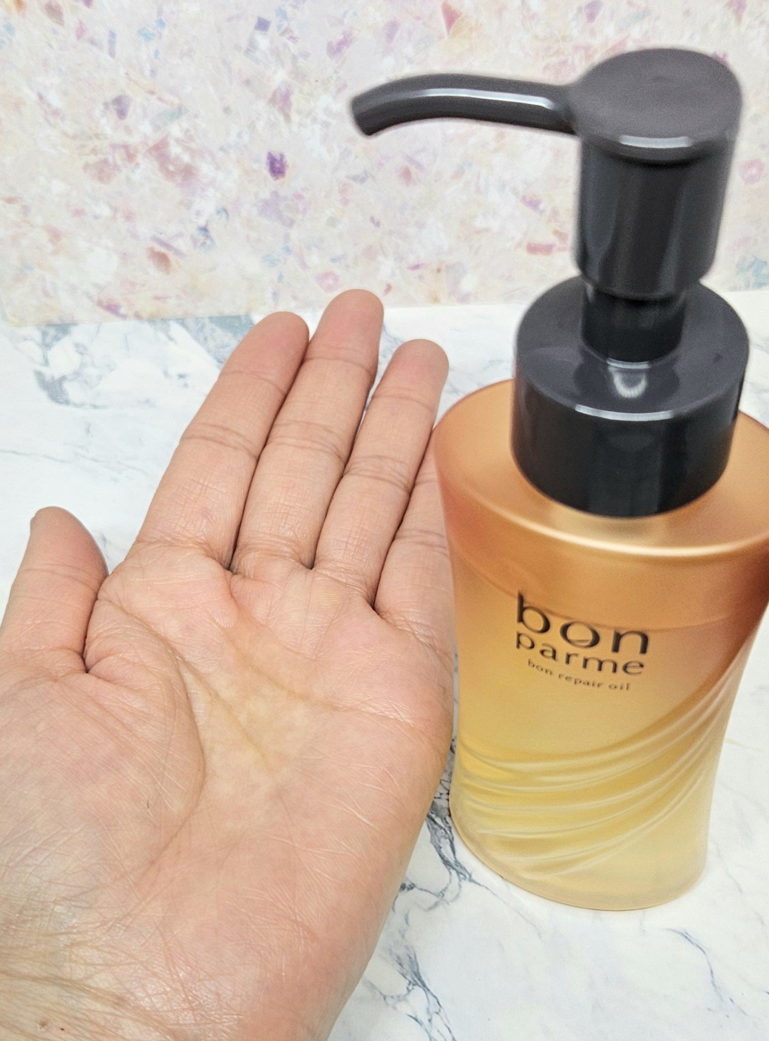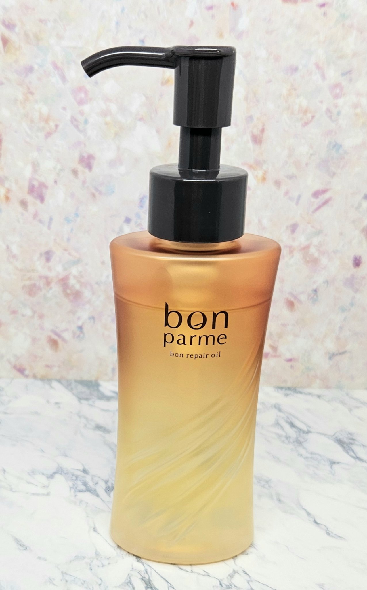 - ダメージ毛先も、広がりも、”つるん”とまとまるんっ! 仕上げのひと滴で”ととのう”ヘアオイル 【アプリコット&ムスクの香り】 ”ととのう”カギは温泉水と美容オイル パサつきや湿気で広がる髪を落ち着かせ、毛先までなめらかに整えるには、 髪の内側の補修と、外側のコートが欠かせません。 せっかく与えたうるおいも、キューティクルが開いたままでは逃げてしまい、 ツヤも手触りも長続きしません。 ボンリペアオイルは、ボンパルム専用の温泉水に美容オイルをかけ合わせ、 髪内部のうるおいを守りながら表面をなめらかにコート。 しっとり軽やかで、毛先まで輝くツヤ髪を叶えます。 ◆セレクト温泉水『シリカ酸性泉』 髪の主成分「ケラチン」をサポートするミネラル『シリカ』に、 キューティクルを引き締めてうるおいを閉じ込める「酸性泉」を合わせた温泉水。 日中の乾燥や摩擦、湿気などによるダメージから髪を守ります。 ◆髪を守る『リッチ美容オイル』 アルガン・ホホバ・バオバブ・月見草・メドウフォームなど 豊富な植物オイルを贅沢に配合。 軽やかなのにしっとりとした質感で、髪のまとまりとツヤを持続させます。 ◆スキンケア発想の『美容成分』 「ビオチン」「グルタチオン」「γ-ドコサラクトン」など、 美容クリニックでも注目されるエイジングケア*成分を配合。 熱ダメージ補修や抗酸化ケアで、髪のハリ・コシ・ツヤをサポートします。 *年齢に応じたケア