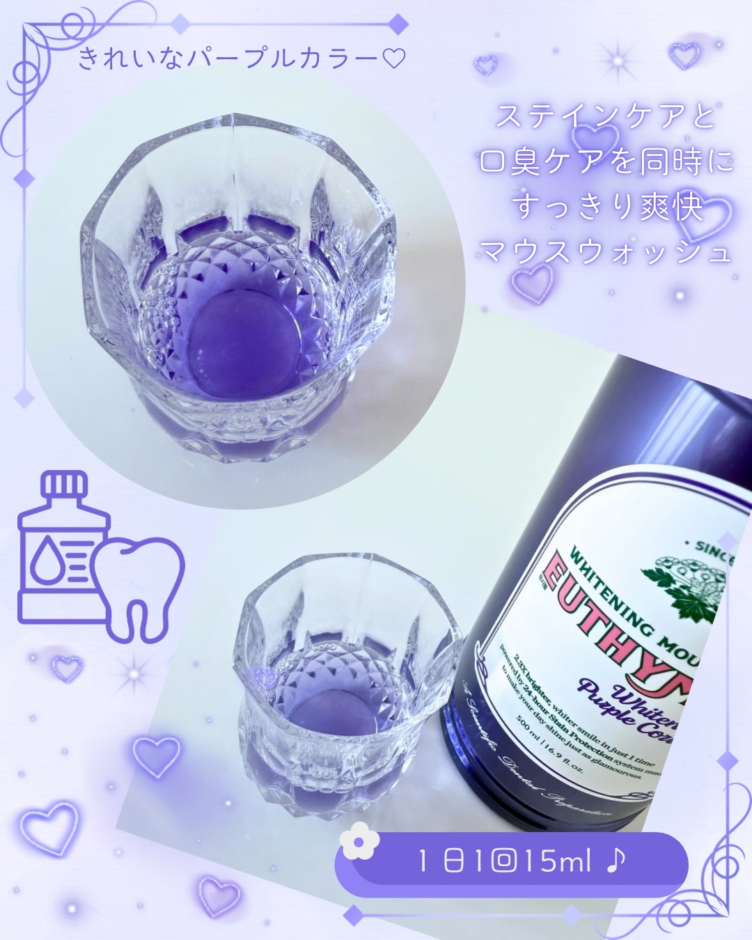 韓国初のホワイトニングマウスウォッシュEUTHYMOLユーシモールパープルコレクターマウスウォッシュ使ってみました💕以前ご紹介したパープルコレクター歯磨き粉がマウスウォッシュに24時間着色保護膜を形成し、着色除去から着色抑制まで✨歯の着色を未...