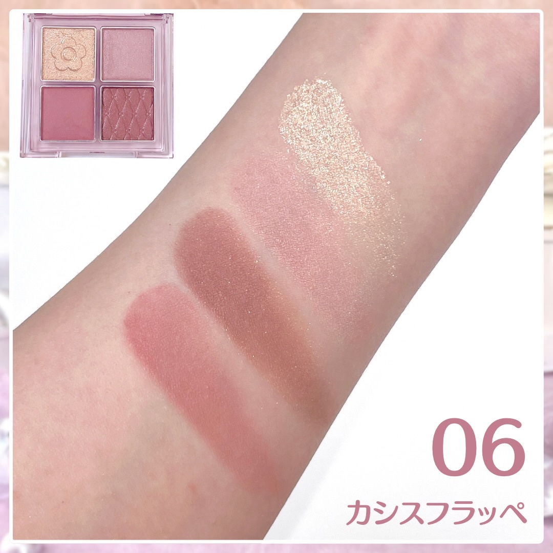 このマットタイプはマット3色とラメ1色の4色構成のアイパレット🎨 マット質感なんだけど重ね塗りしても重たくならず、むしろ透け感のあるツヤ感が出るの!! ほんのりツヤも感じる仕上がりになるので、マット系のアイシャドウが苦手な方でも使いやすい☺️ 粉質がしっとりしているので、粉飛びせずしっかりと肌に密着してくれるしさらっとした軽いつけ心地♡ 今回の新色チュチュバレリーナは甘さ控えめのピンクグレージュカラー!! 全体的に青み感のあるくすみカラーなのでブルベさんやくすみカラーが好きな方は絶対好きだと思う!! M06リマグレージュと比較するとチュチュバレリーナの方が青み強めで、程よく甘く儚い印象に仕上がるのが可愛い♡♡ 左上のシルバーラメが繊細でチラチラ輝いて最高に可愛いんよ…!! こちらの新色は2023年12月下旬よりイオンにて先行発売中、2024年1月下旬より全国発売、2024年4月頃定番化予定です!!
