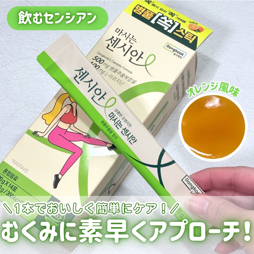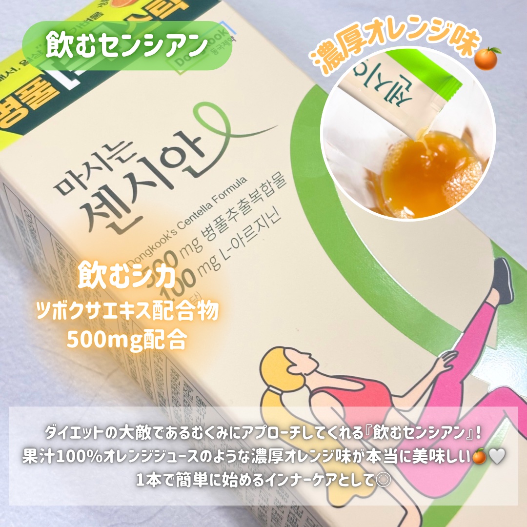韓国の東国製薬から新しく出たむくみケア習慣、「飲むセンシアン」🌿「飲むシカ」成分配合のインナーケアアイテムで、溜め込みがちな体を内側から軽やかにしてくれます✨甘酸っぱいオレンジ味で、サプリというよりデザート感覚🍊1回分ずつの個包装だから、旅行...