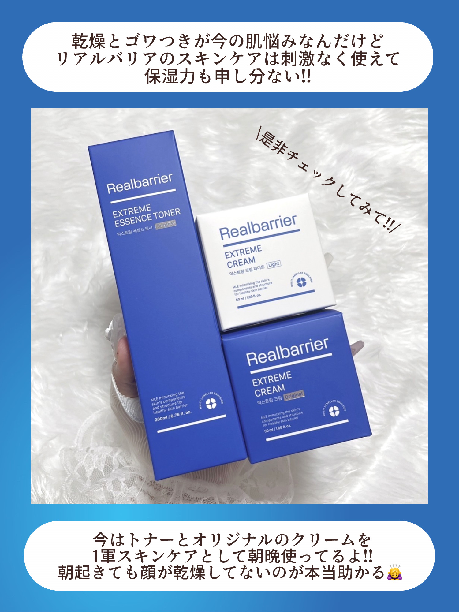 RealBarrierエクストリームエッセンストナーオリジナルリアルバリアエクストリームクリームオリジナルリアルバリアエクストリームクリームライトリアルバリアの肌バリアトリオ❗お試しさせていただきました。トロっとしたエクストリームエッセンスト...