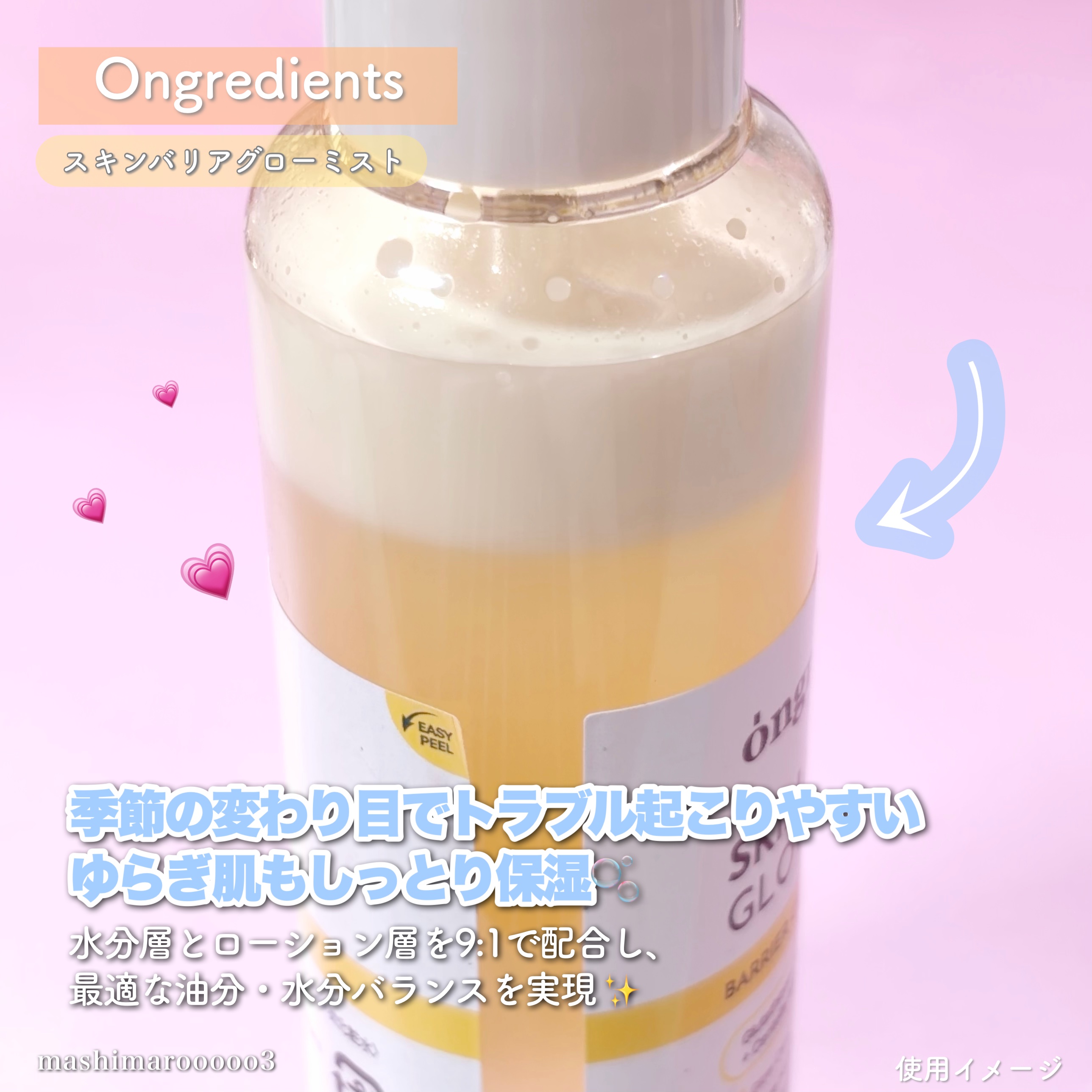 - 「ongredients(オングリディエンツ)」が、ついに日本のオフライン店舗に登場! <2025年8月30日(土)(*1)より全国のプラザ、ドン・キホーテ(*2)にて先行販売を開始> 水光トナーと水分グロウ(ツヤ)成分が融合し、まるでハイライトを施したようなツヤ肌ミストを実現 【主要成分】 ・ツボクサ葉エキス(*3) 乾燥などの外的刺激を受けた肌を整え、肌バリア(*4)機能を守ります。 ・複合ペプチド(*5) 肌のコンディションを整え、ハリのある肌印象へと導きます。 ・ヒアルロン酸(*6)&パンテノール(*7) 乾燥した肌を保湿ししっとり健やかに保ちます。 【こんな方におすすめ】 ・外的刺激により乾燥で肌がゆらぐのが気になる方 ・保湿とキメのダブルケアをしたい方 ・メイクの上からでも!外出先でも、肌にうるおいを与えたい方 (*1)店頭開始日となり、購入可能日は各店舗により異なります。 (*2)一部店舗を除きます。 (*3)整肌成分 (*4)角質層のうるおいを保つこと (*5)トリペプチド-1銅,トリペプチド-1,パルミトイルトリペプチド-1,パルミトイルペンタペプチド-4,ヘキサペプチド-11,ヘキサペプチド-9 (*6)ヒアルロン酸Na,ヒアルロン酸クロスポリマーNa,ヒアルロン酸K,ヒアルロン酸ヒドロキシプロピルトリモニウム,加水分解ヒアルロン酸Na,加水分解ヒアルロン酸,ヒアルロン酸(保湿成分) (*7)保湿成分