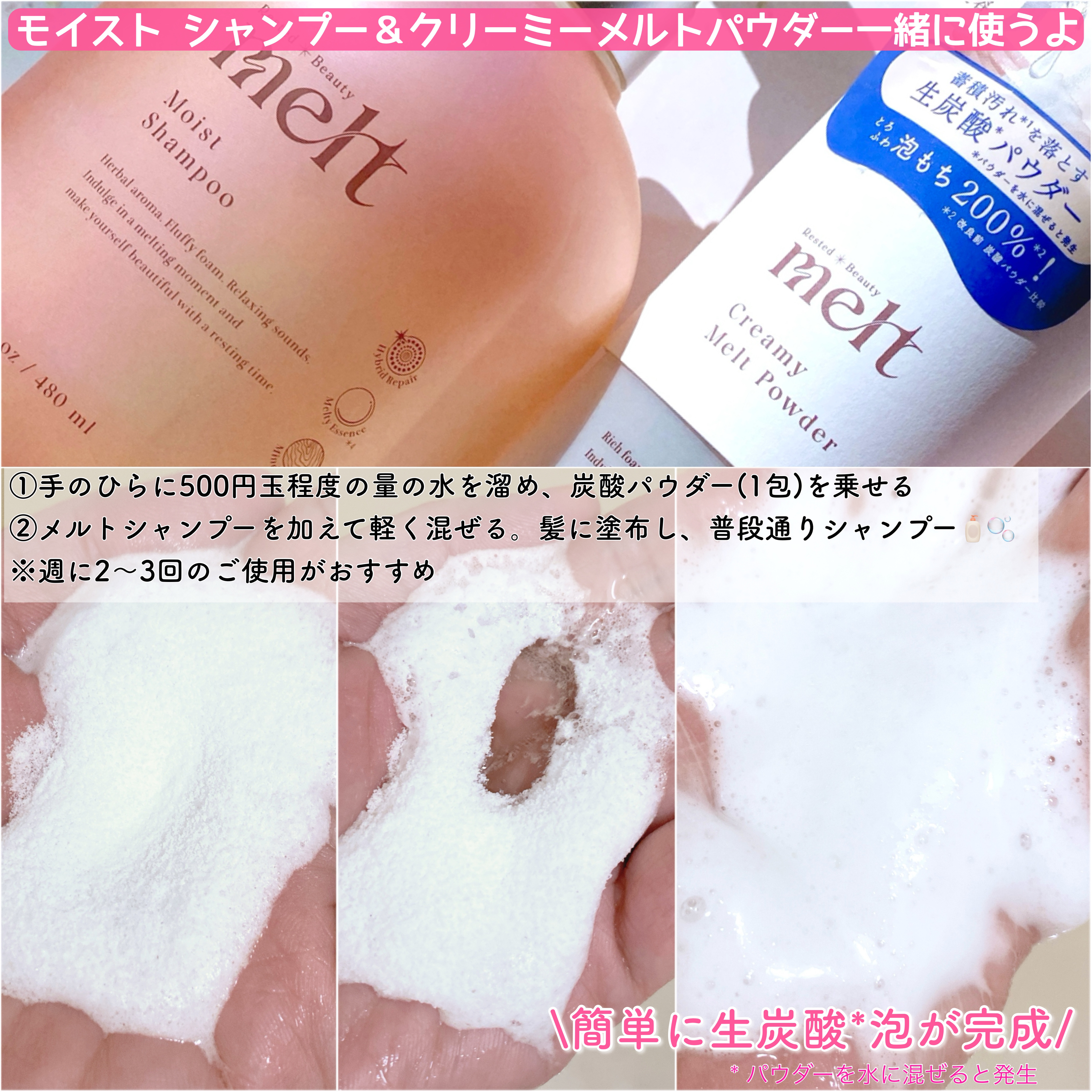 meltモイストシャンプー&トリートメント♡クリーミーメルトパウダー♡炭酸パウダーが泡質やクレンジング感をアップしてリニューアル💖毛穴より小さい炭酸泡で髪に蓄積した汚れをすっきりオフしてくれるそう🫧パウダーと水、シャンプーを混ぜて使うよ!軽く...