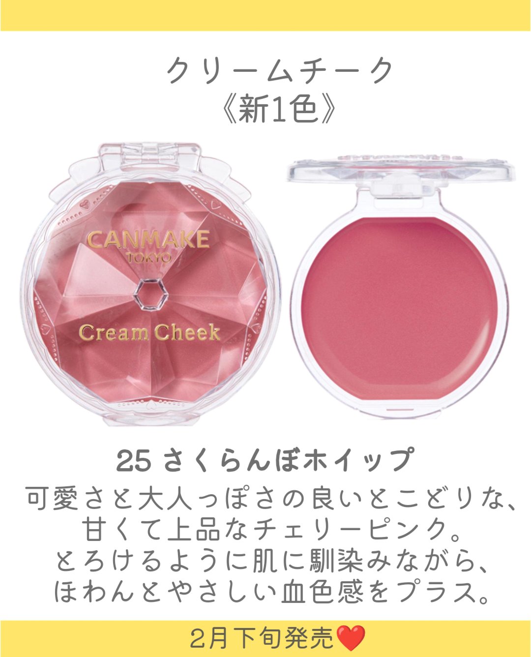 キャンメイク新作速報🎀大人気のクリームチークから新色登場!これがとにかく可愛いの…🍒クリームチークはベタベタするのが苦手!って人にはキャンメイクをおすすめしたいな。塗ると艶々ではなくサラッとする感じの仕上がりだよ。2026年2月下旬発売予定🗓...