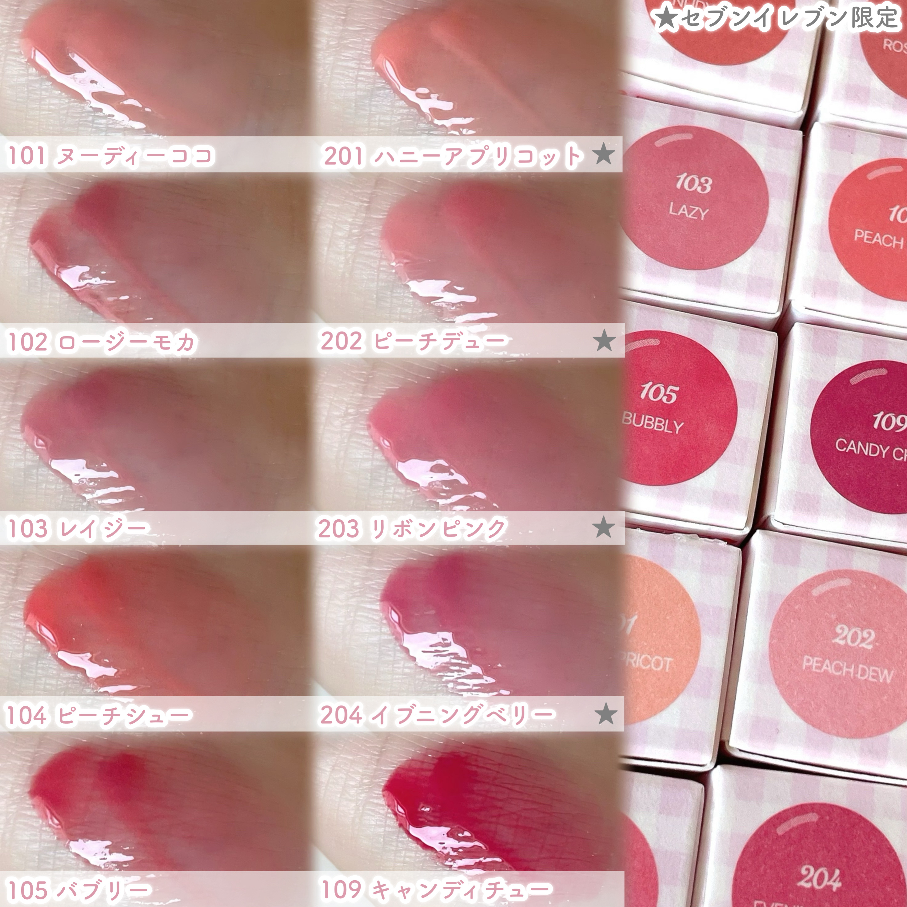 #PR#2aN🤍セブンイレブン限定新作ミニグレイズバウンシングティント10種101ヌーディーココ102ロージーモカ103レイジー104ピーチシュー105バブリー109キャンディチュー201ハニーアプリコット202ピーチデュー203リボンピンク...