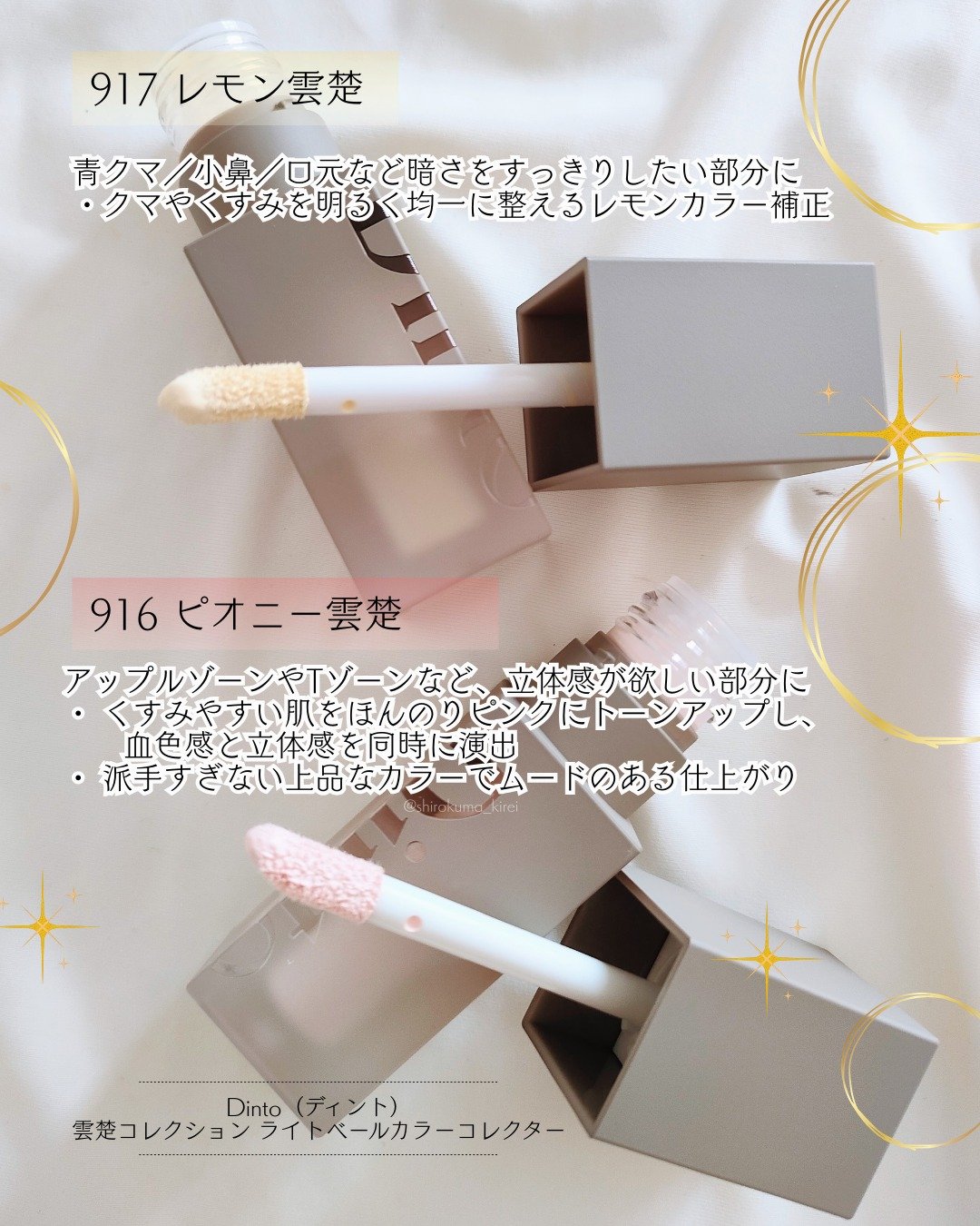 Dinto☁️⸝⸝꙳ライトベールカラーコレクター916ピオニー雲楚🌸917レモン雲楚🍋・みずみずしいテクスチャ・少量でも伸びが良い・微細粒子でムラなく密着して持ちがよい・厚塗り感がない916ピオニー雲楚🌸・くすみをピンクの補色で自然にトーンア...