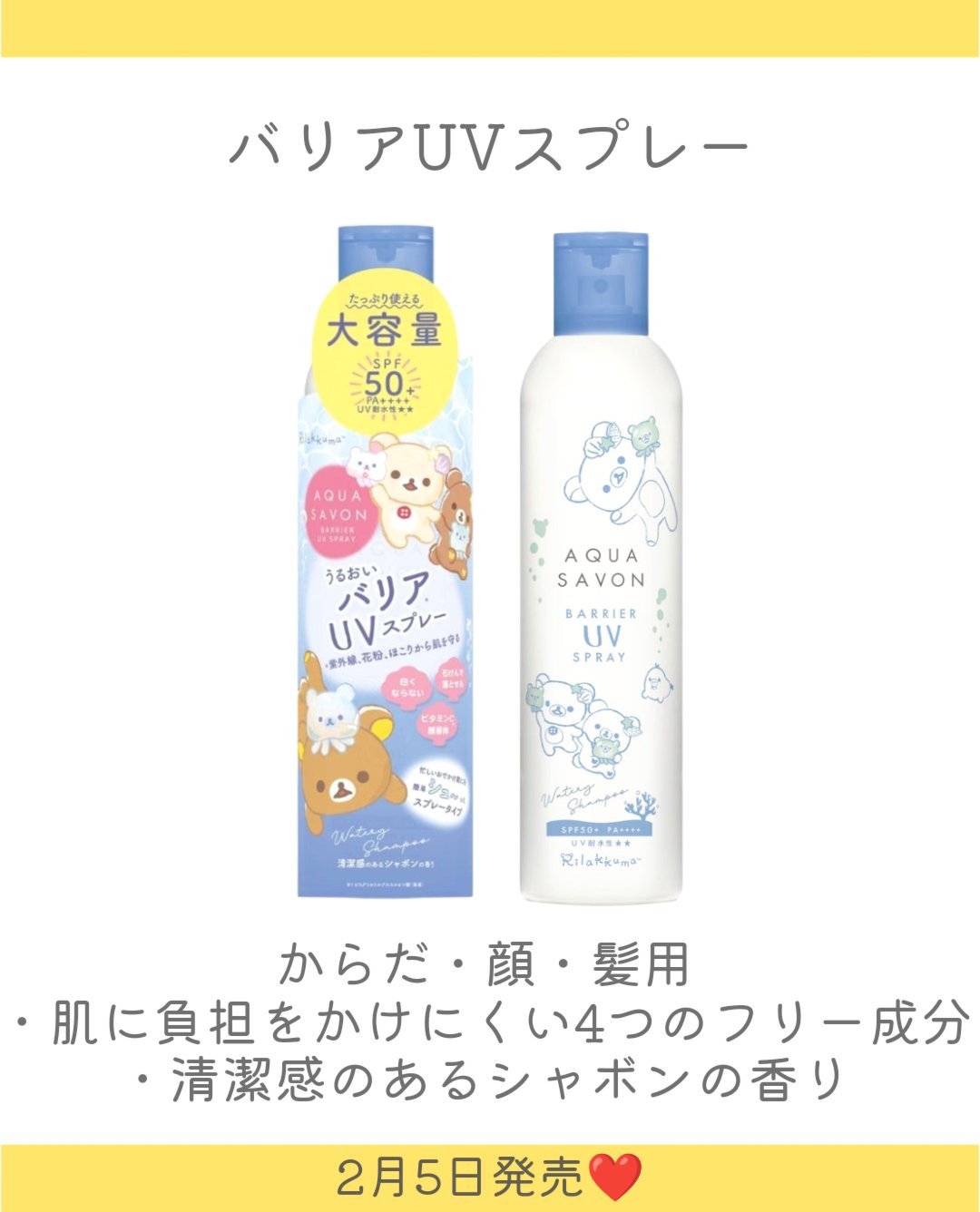- 紫外線、花粉、ほこりから肌を守る(※1) 、うるおいバリアUVスプレー ◉SPF50+・PA++++・耐水性★★ 国内最高基準値の紫外線カット効果と耐水性。普段使いにも紫外線が強い日のお出かけにも。 ◉トリプルセラミド(※3)配合 紫外線で乾燥しがちな肌にうれしいうるおい成分。 ◉さらさらヴェール(※4)処方 ◉ビタミンC誘導体(※5)配合 ◉石けんで落とせる 専用クレンジング不要で手軽に使えて、日常使いにもぴったり。 白くならず、たっぷり使える大容量サイズです。 POINT➀ 人気No.1(※6) ウォータリーシャンプーの香り 累計出荷本数100万本(※7)を突破するロングセラー香水と同じ香り。清潔感のあるシャボンの香りで、日焼け止め特有のにおいが苦手な方にもおすすめです。 POINT➁ 肌に負担をかけにくい4つのフリー成分&パッチテスト済(※8) からだに使用するものだから、こだわった商品設計。パラベン・鉱物油・アルコール(エタノール)・動物由来原料がフリー。 ※1 外的刺激から皮膚を保護する※3 うるおい成分(セラミドAP・セラミドNG・セラミドNP) ※4 シリカ(感触改良剤) ※5 ビスグリセリルアスコルビン酸、テトラヘキシルデカン酸アスコルビル(製品の抗酸化剤) ※6 アクア シャボン シリーズ内 ※7 2024年1月末時点 ※8 すべての方に肌トラブルが起こらないということではありません。 EC先行発売 2月1日(木) / 一般発売 2月20日(火)