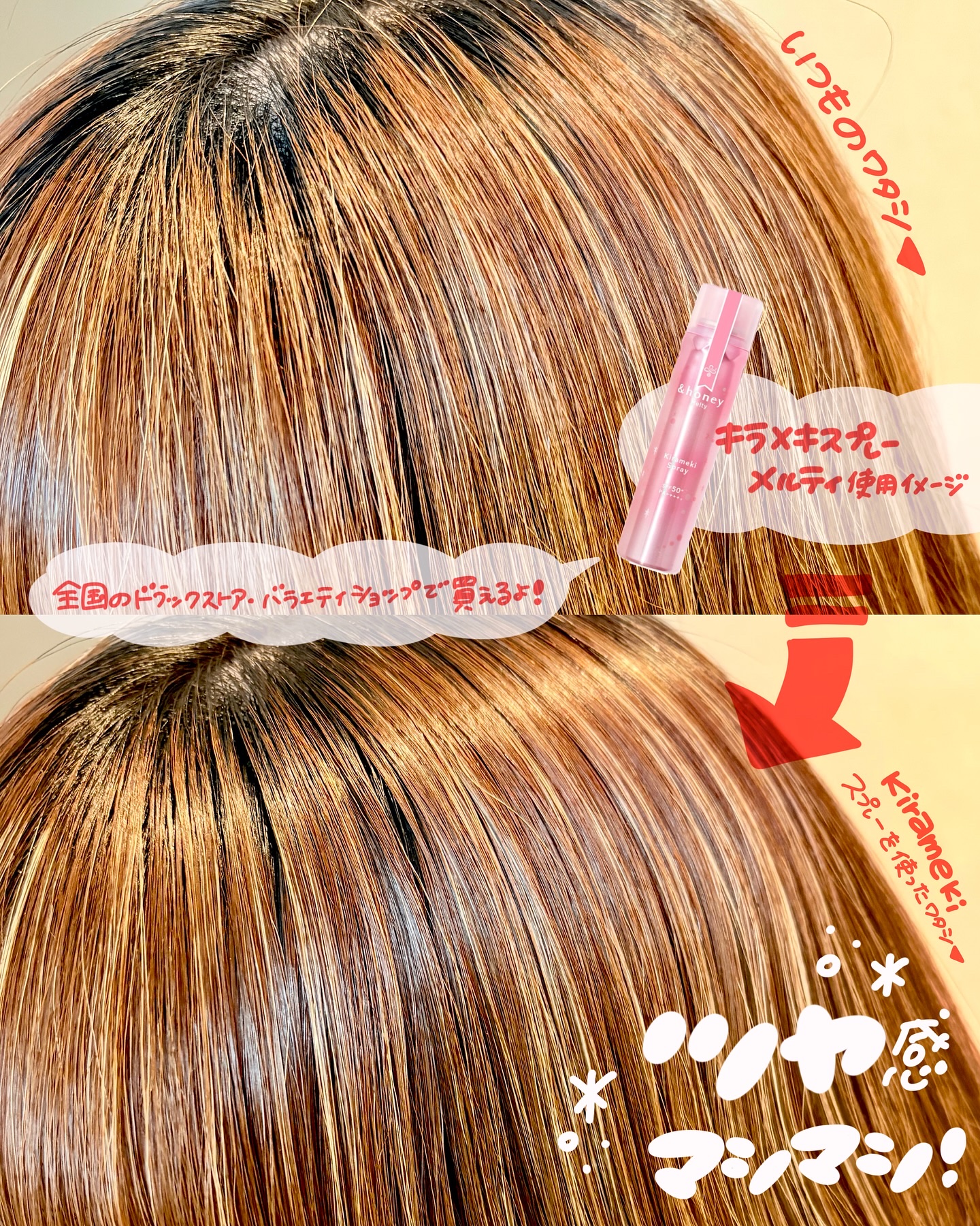 - &honeyシリーズ初のツヤ出しスプレー。 “ツヤ”と“UV対策”の両方を叶えた、上質なスタイリング兼日焼け止めアイテムです。 ダブルツヤ成分*1 が瞬間ひと吹きで髪の光沢を110%※1 に。 UV対策成分*2 が髪や肌を外的ダメージから守ります。 ピュアローズハニーの香り ⭐︎持ち運びに便利なミニサイズ缶も数量限定で発売! ※1 当社既存品比(&H ヘアミルク ミルキー比) *1 白金・加水分解シルク、白金・加水分解ケラチン(羊毛)(全て光沢・補修) *2 メトキシケイヒ酸エチルヘキシル(紫外線防止)、オウゴン根エキス(保湿)