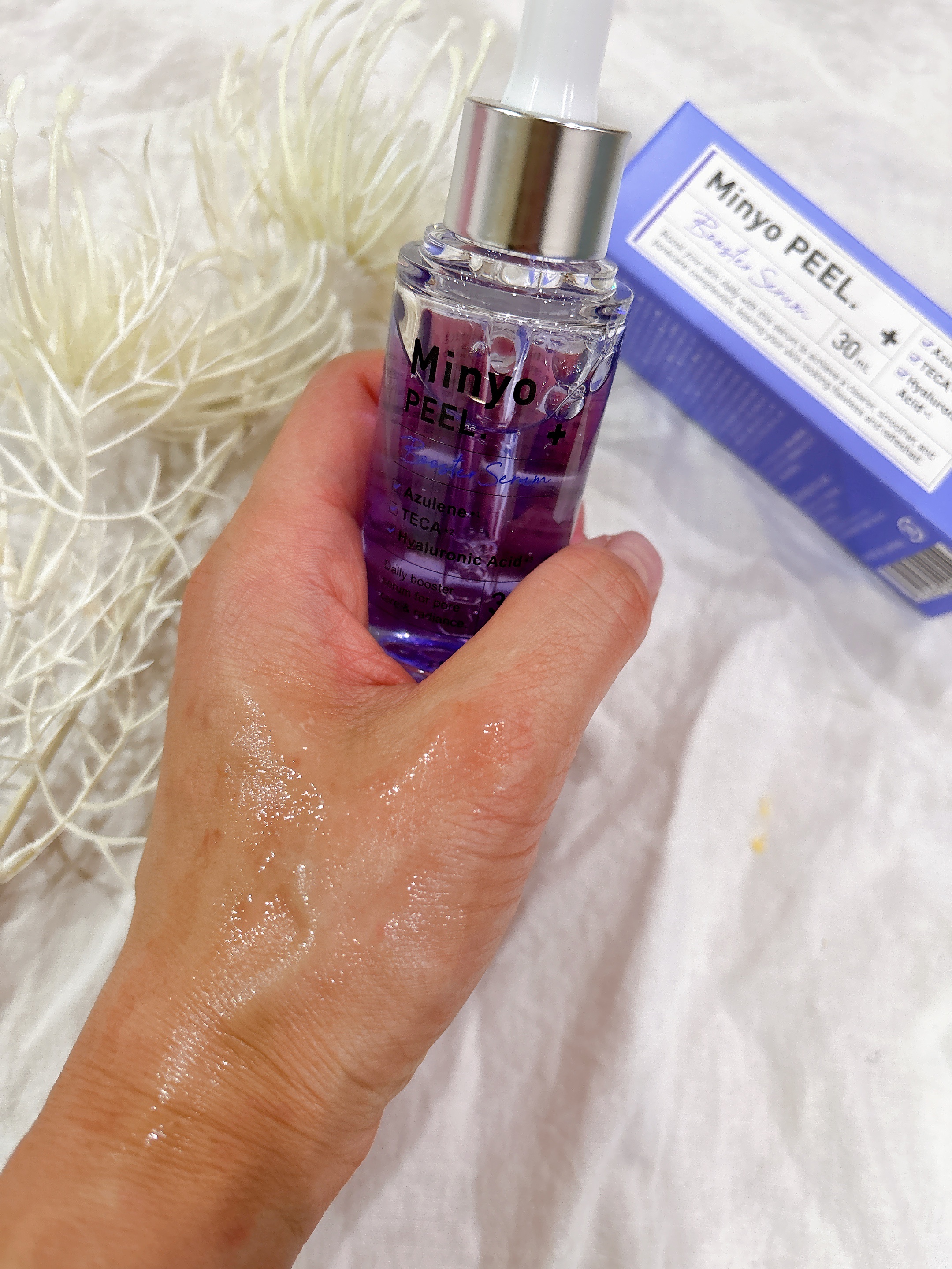 MinyoPEEL.(ミニョピール)鎮静作用のあるグアイアズレンを配合した導入美容液です。他には、毛穴、肌荒れ、くすみ、ハリツヤなど大人の肌悩みを1本でまるごとリセットが期待できる美容液です。ブルーの色が綺麗です。緩いジェルのようなテクスチャ...