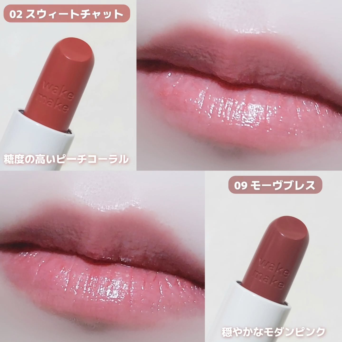 wakemakeHEALTHYGLOWBALMSTICK02スウィートチャット09モーヴブレスwakemakeは4月末からリブランディングしてロゴが小文字に!パケも可愛い🤍Amazon・全国バラショ(一部店舗除く)で販売中!唇がキレイに見える...