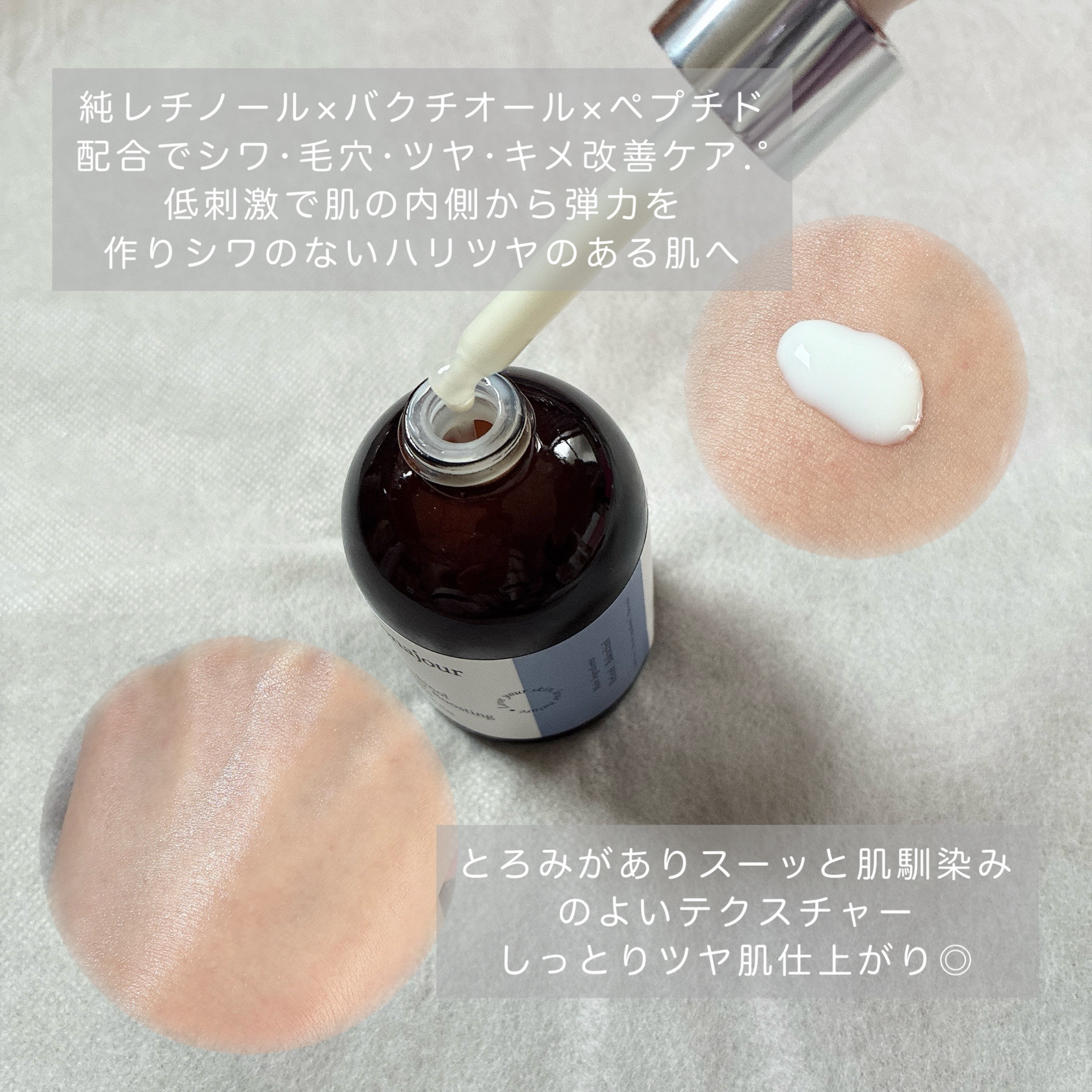 🎀ⵗコスメレビュー🧸🌷夜のスキンケアにちょっとプラスするならBonajourのレチノールパワーブースティングセラムとバクレチパワーコンセントレートクリームの組み合わせがおすすめ🐶🩵セラムはみずみずしいテクスチャーで肌になじみやすく、ク...