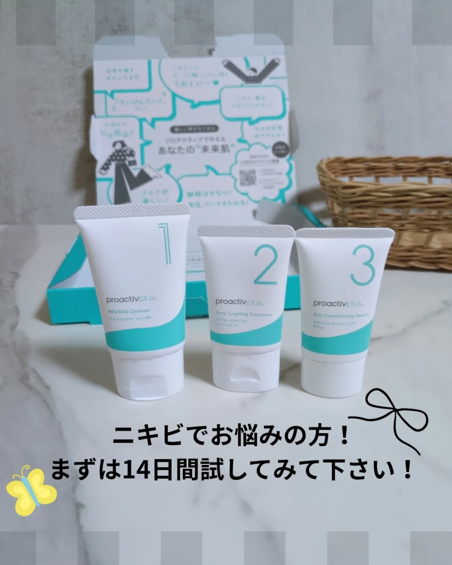 - プロアクティブ プラスが着目するのは、 「ニキビ発生のメカニズム」。 このメカニズムは「古い角質」「過剰な皮脂」「アクネ菌の増殖」の3つの要因によって構成され、年齢やジェンダーに関わらず、すべてのニキビの根幹に共通して存在します。 プロアクティブのスキンケアは、このメカニズムに突入しないようにするために考え抜いた「3ステップスキンケア」。 <STEP1>洗う :薬用洗顔料 <STEP2>届ける:薬用美容液 <STEP3>整える:薬用ジェル状クリーム このプロアクティブの3ステップスキンケアをより気軽にお試ししいただける14日分トライアルセット。 <セット製品>すべて14日分 ●マイルドミルククレンザー(薬用洗顔料):40g ●ポアターゲティング トリートメント(薬用美容液):20g ●スキンコンディショニング セラム(薬用ジェル状クリーム):20g ※洗顔料はマイルドミルククレンザーのみ