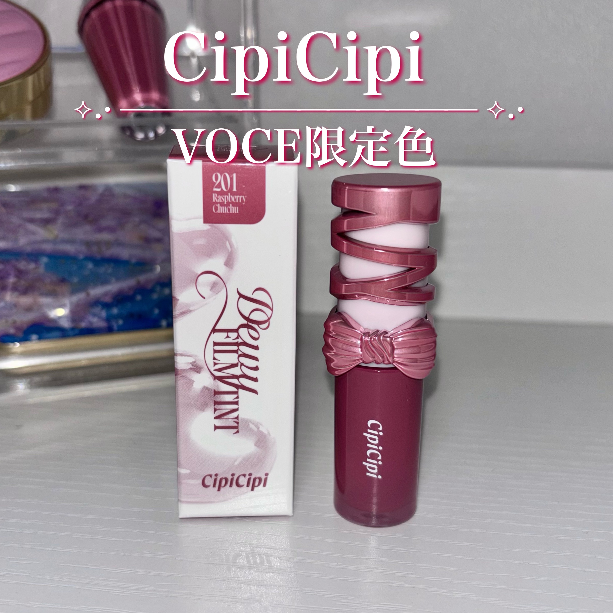 リボンパケがかわいい🎀CipiCipiシピシピ デューイフィルムティント R12ラズベリーチュチュVOCE限定カラー色は2枚目のものが近いです。くすんだ暗い青みカラー。塗り重ねるとかなり暗くなってヴィランリップみたいになる。色残りというか、染...